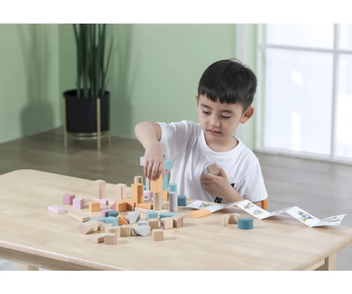 Este juego de construcción está formado por 60 bloques de diferentes formas y colores, con colores naturales pintados a mano