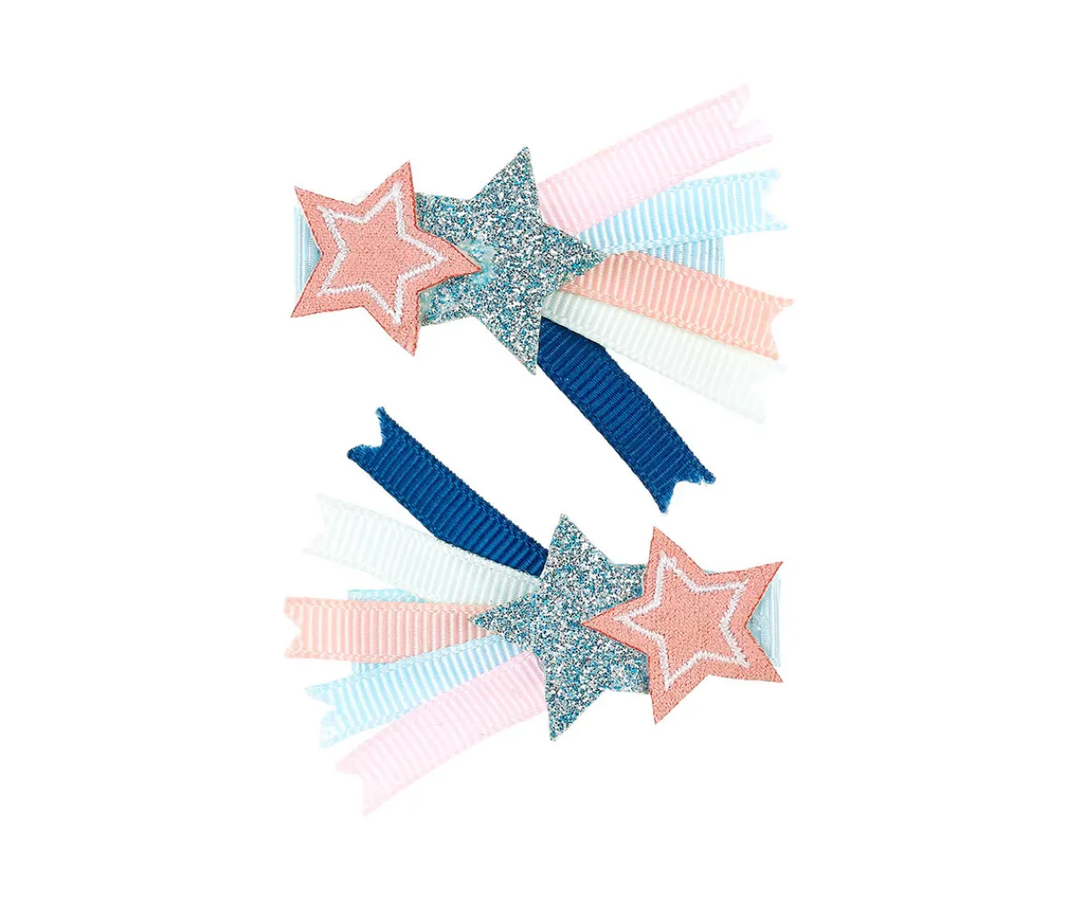 Este encantador set incluye dos pinzas, decoradas con estrellas recortadas y una coleta de cinta brillante que crea un precioso efecto de estrella fugaz.