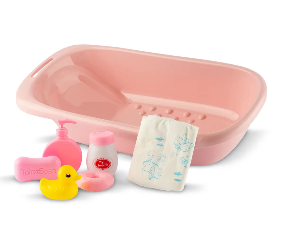 - Incluye: Bañera, jabón, bote de champú, patito de goma, pañal, bote de polvos de talco, juguete para el agua