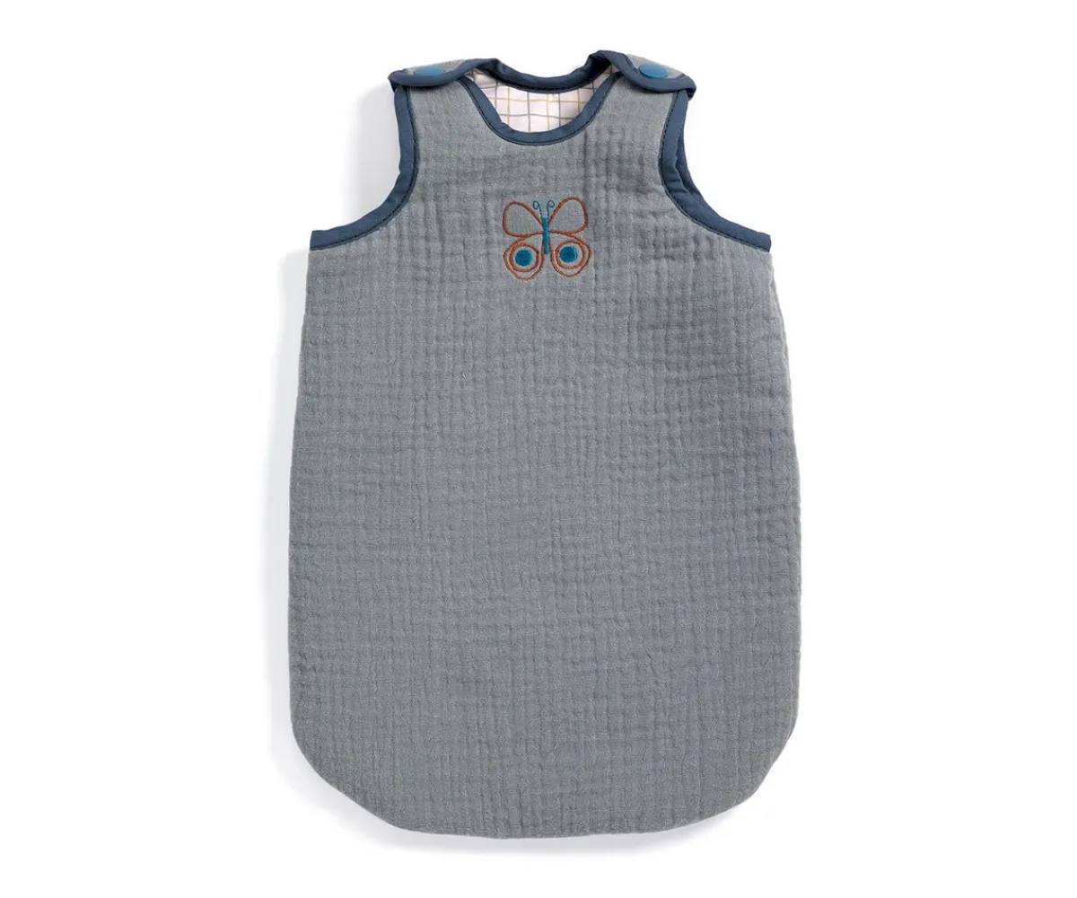 Precioso saco de dormir para muñecas de Djeco Pomea con una mariposa bordada en gris.