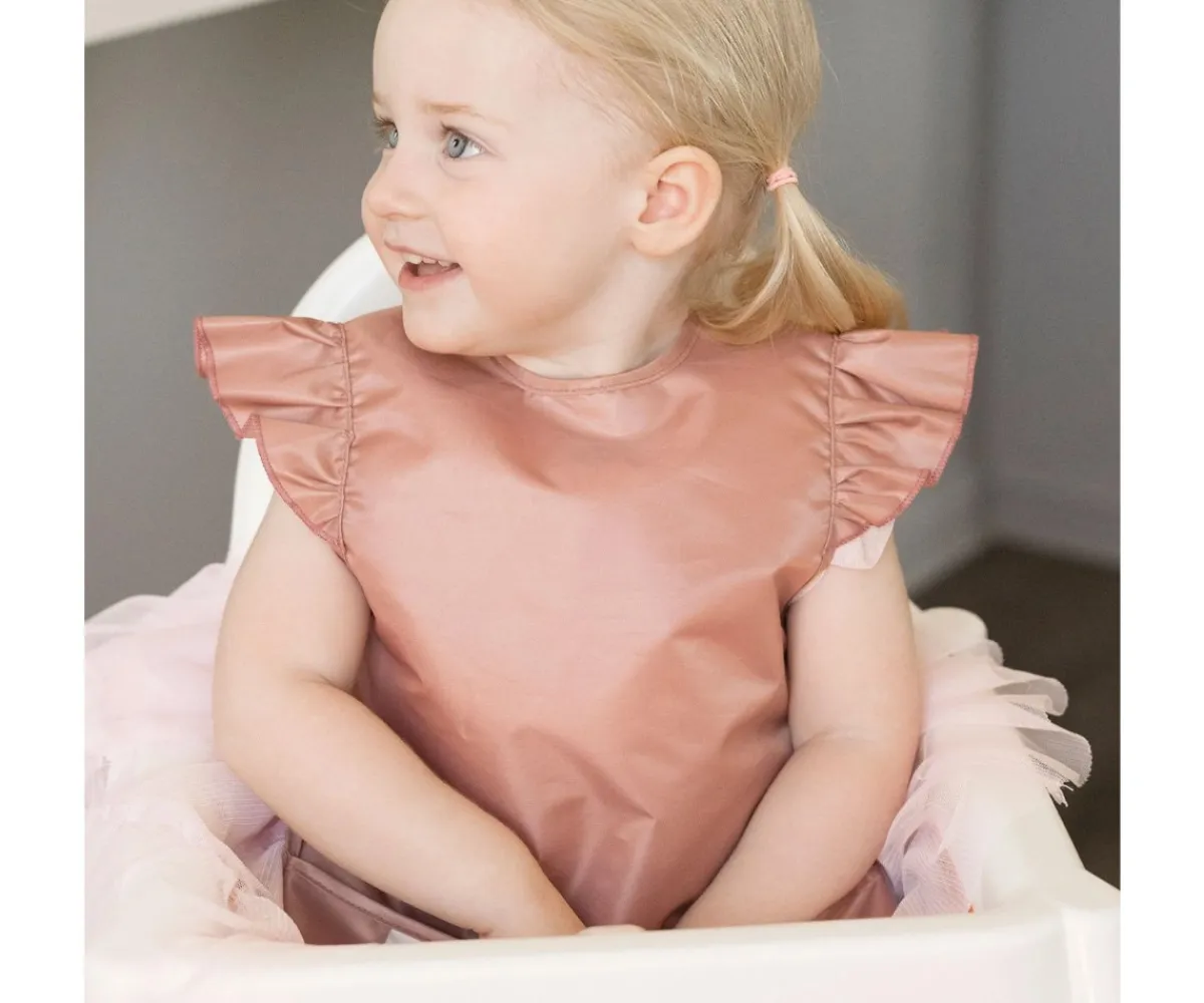 El babero tipo delantal de Tiny Twinkle está fabricado en poliéster suave y muy liviano. Es impermeable y está hecho en plástico 100% reciclado.