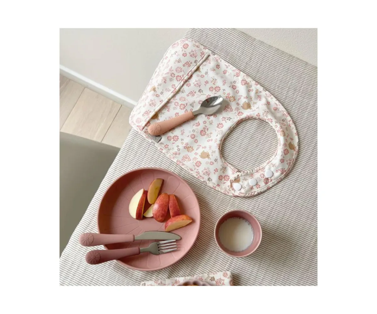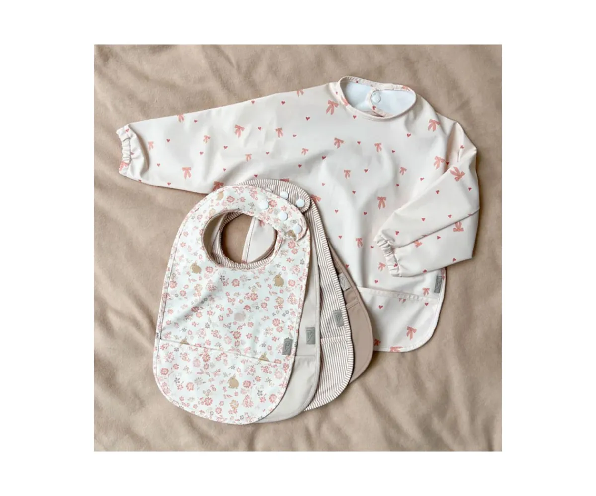 Facilita las comidas de tu bebé con este set de dos baberos lavables con bolsillor recogemigas en la parte delantera y que se ajustan cómodamente gracias a su dos cierres de polleras en su parte posterior. Son impermeables y encontrarás un diseño estampado y otro liso.