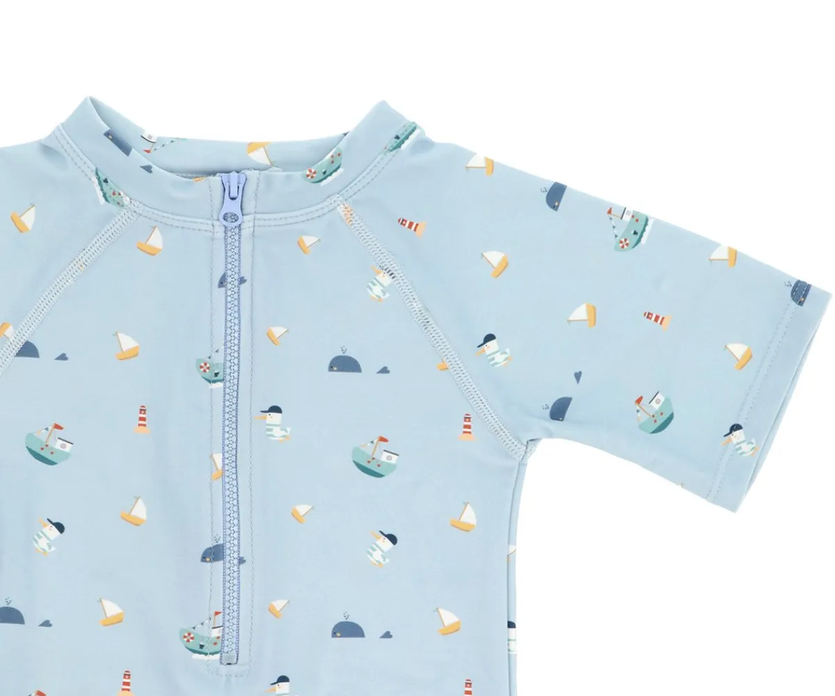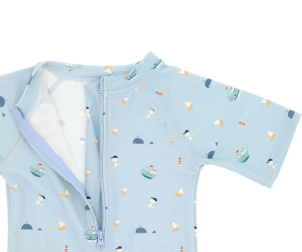 Los bañadores con cremallera delantera y preciosos estampados de las colecciones Verano Monnëka 2025 han sido confeccionados con una tela especial que protege la piel de los peques de los rayos solares.