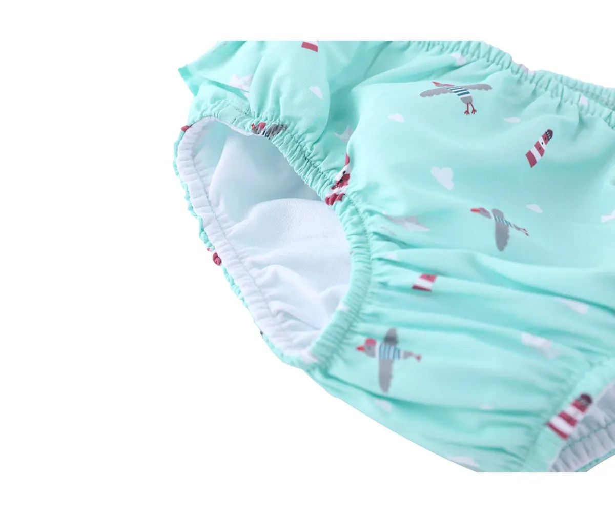 Bañador pañal de la colección Lighthouse de Monnëka que ha sido creado con una tela especial que protege a la piel de los rayos solares además que evita fugas sólidas cuando el peque se está bañañdo en la playa o la piscina.