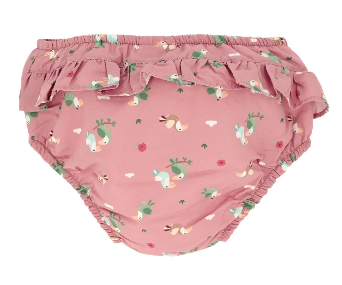 Los bañadores pañal con volantes de las colecciones de Verano Monnëka 2025 están fabricados con una tela especial que protege a la piel de los rayos solares además que evita fugas sólidas cuando el peque se está bañando en la playa o la piscina.