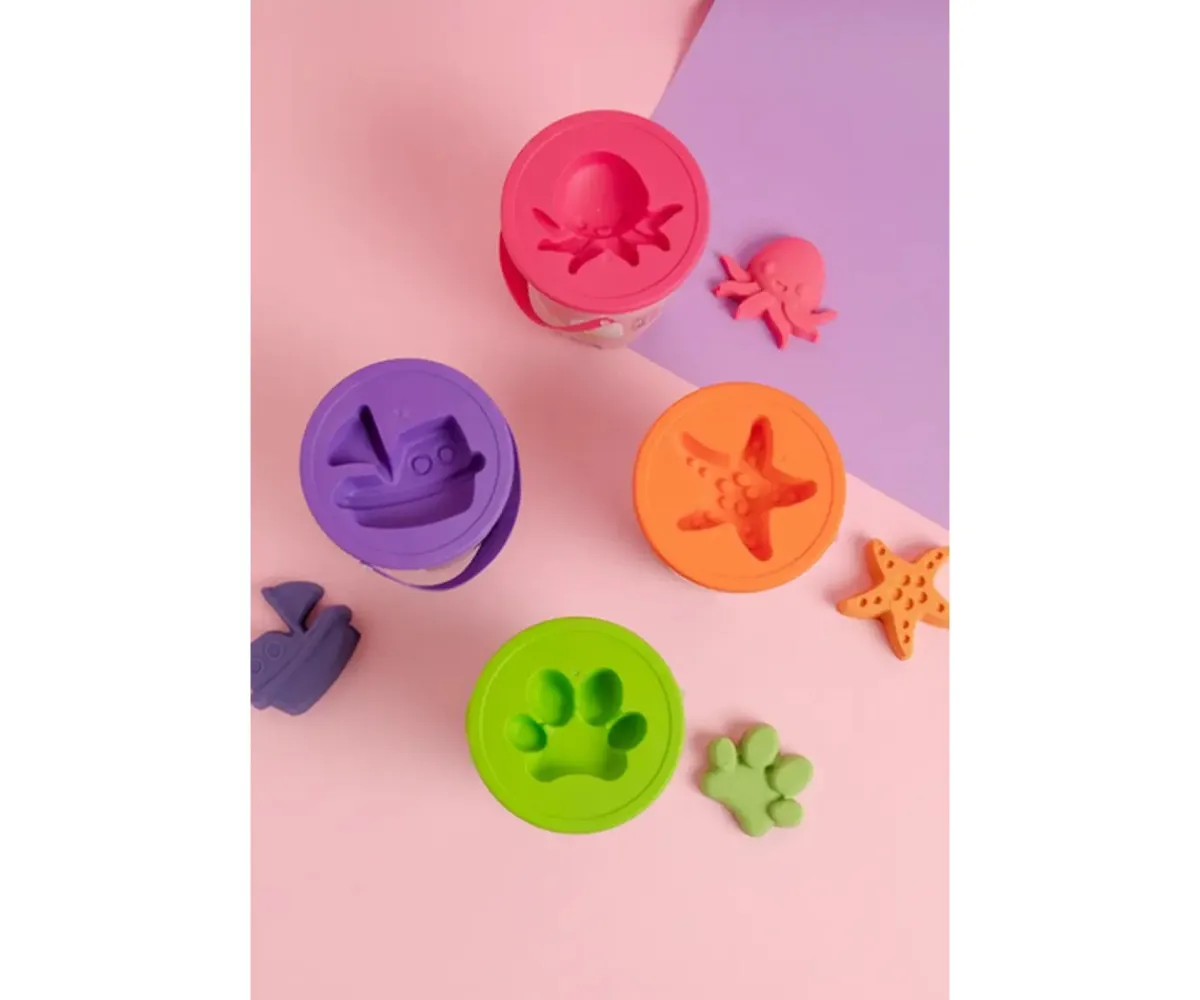 - El envase funciona como un cubo de arena que tiene en su tapa un original molde