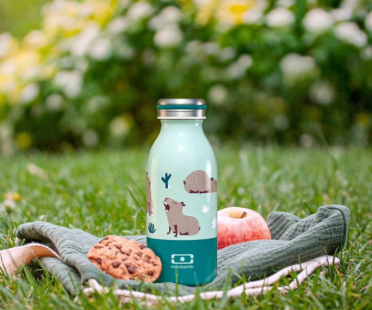La botella mini con original estampado Capy de Monbento mantiene las bebidas a la temperatura perfecta donde quiera que vayas.