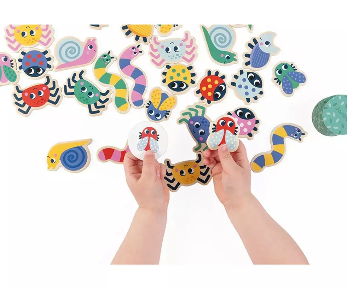 - Incluye: 42 insectos de madera (7 orugas, 7 mariquitas, 7 caracoles, 7 escarabajos, 7 arañas y 7 moscas), 42 cartas redondas de cartón y 1 bolsa de algodón para guardar y llevar contigo