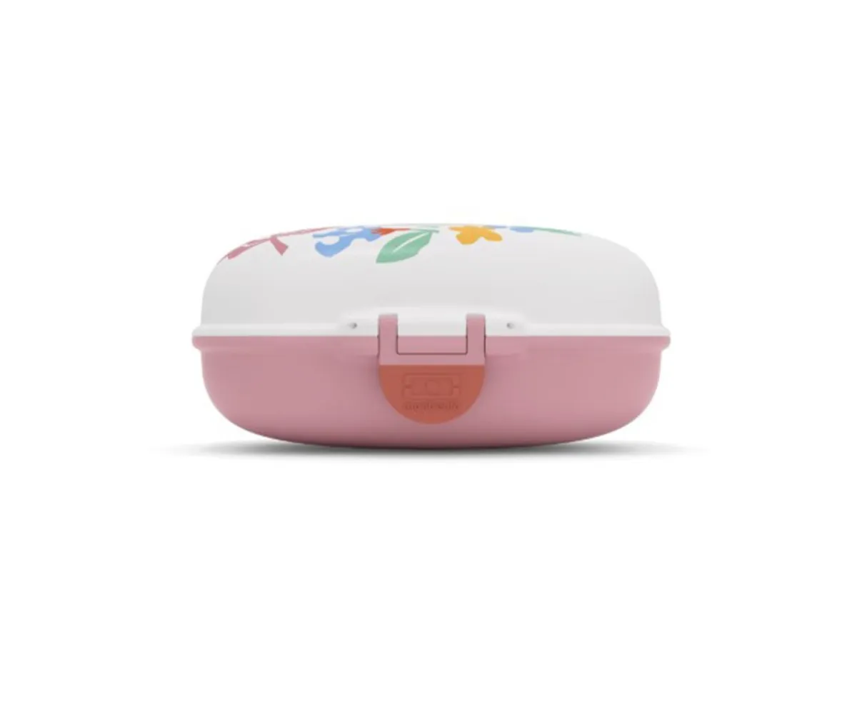 Con un look marcado por su lengüeta de cierre, esta snack box de formas divertidas puede personalizarse gracias a sus fichas intercambiables.