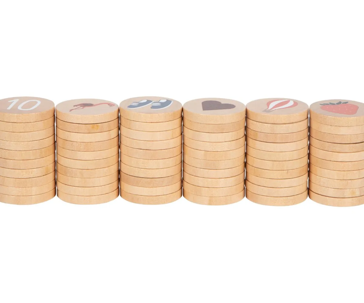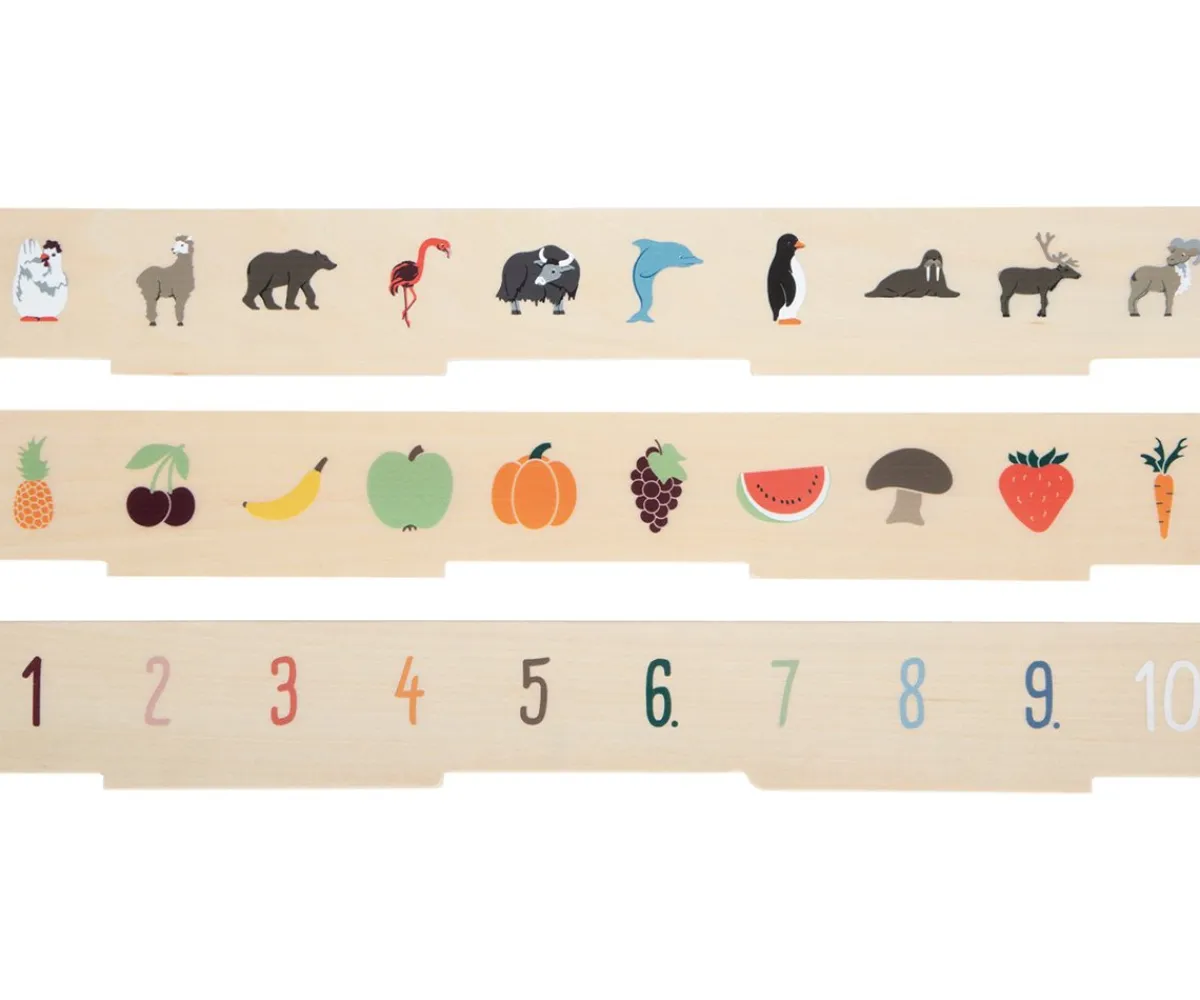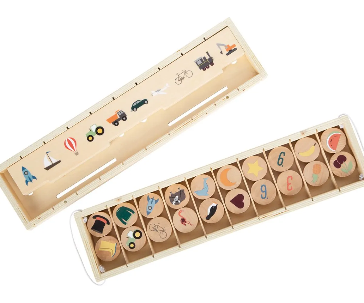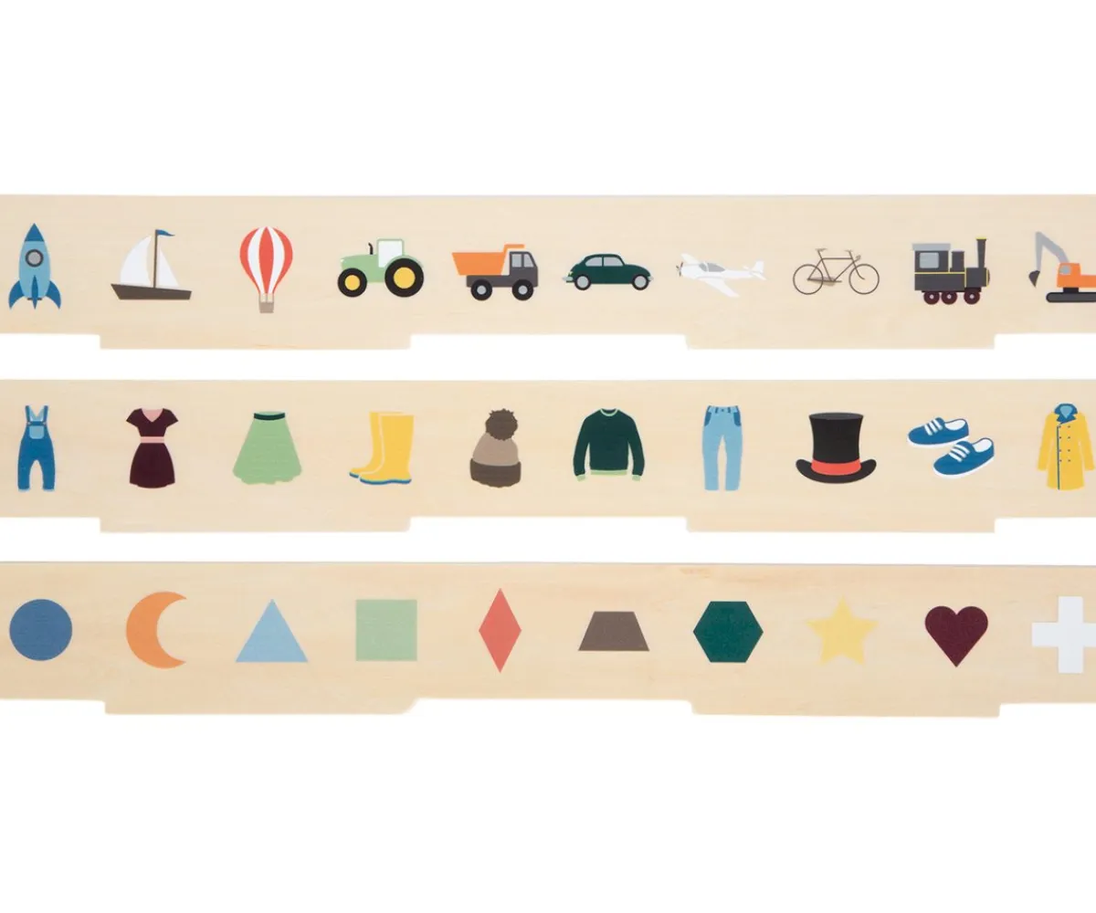 - Incluye: 1 caja de madera, 3 listones con imágenes por ambos lados y 60 fichas de imágenes con temas de: movilidad, animales, números, formas, prendas de vestir, frutas y verduras
