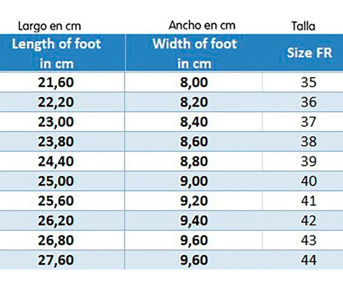 - Recomendamos elegir la talla que se usa habitualmente, si quisiéramos llevar el pie más suelto porque lo tenemos ancho, elegir una talla superior.
