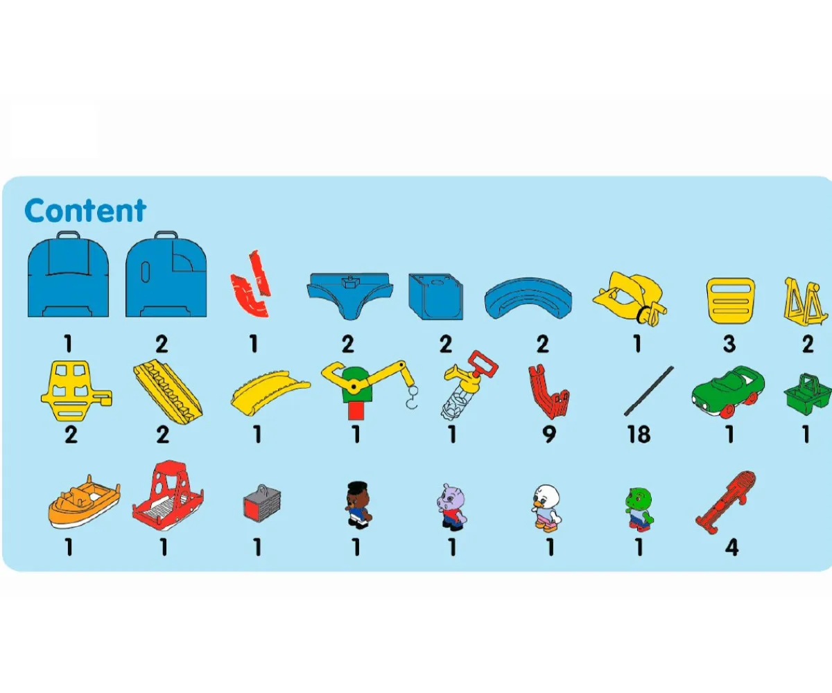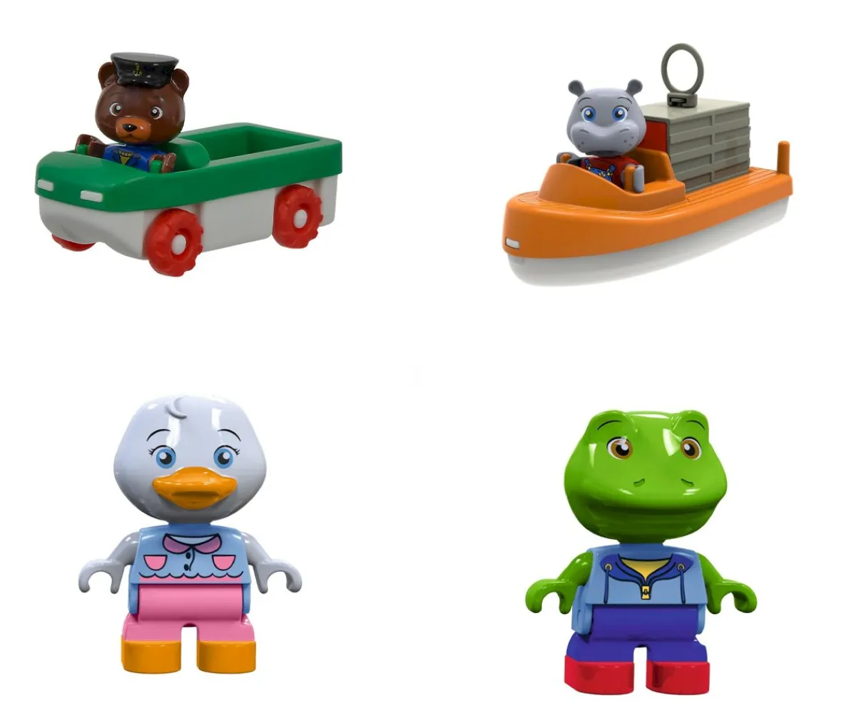 - Incluye: el Oso, el Capitán Bo, Wilma la Hipopótamo, Lotta la Pata, Nils la Rana, circuito AquaPlay con diferentes estaciones (grúa, rampa, compuertas, bomba de agua), coche anfibio ,ferry, barco portacontenedores