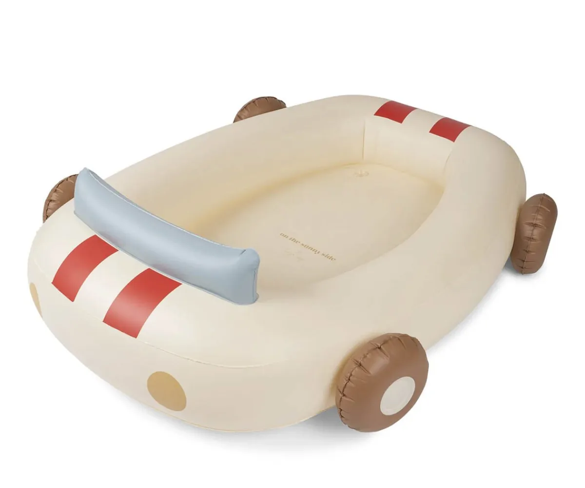 Piscina con forma de coche en color crema con rayas rojas de Konges Slojd, divertido diseño para bañar a los peques en la playa o en el jardín.