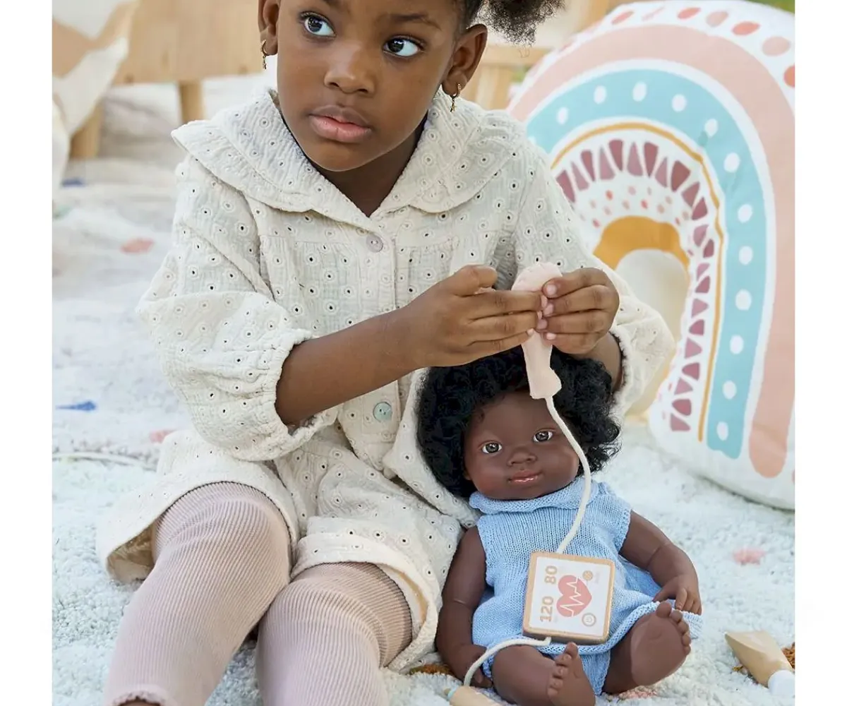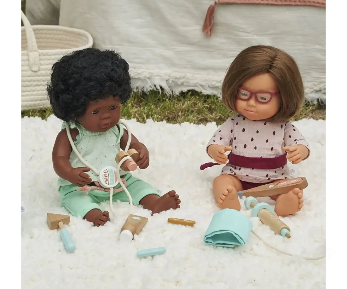 Un maletín compuesto por 7 piezas de madera para que los peques puedan jugar a curar a sus muñecos. Incluye un tensiómetro, un estetoscopio, un gel, un martillo para reflejos, una jeringuilla, un termómetro y 3 tiras de temperatura intercambiables.