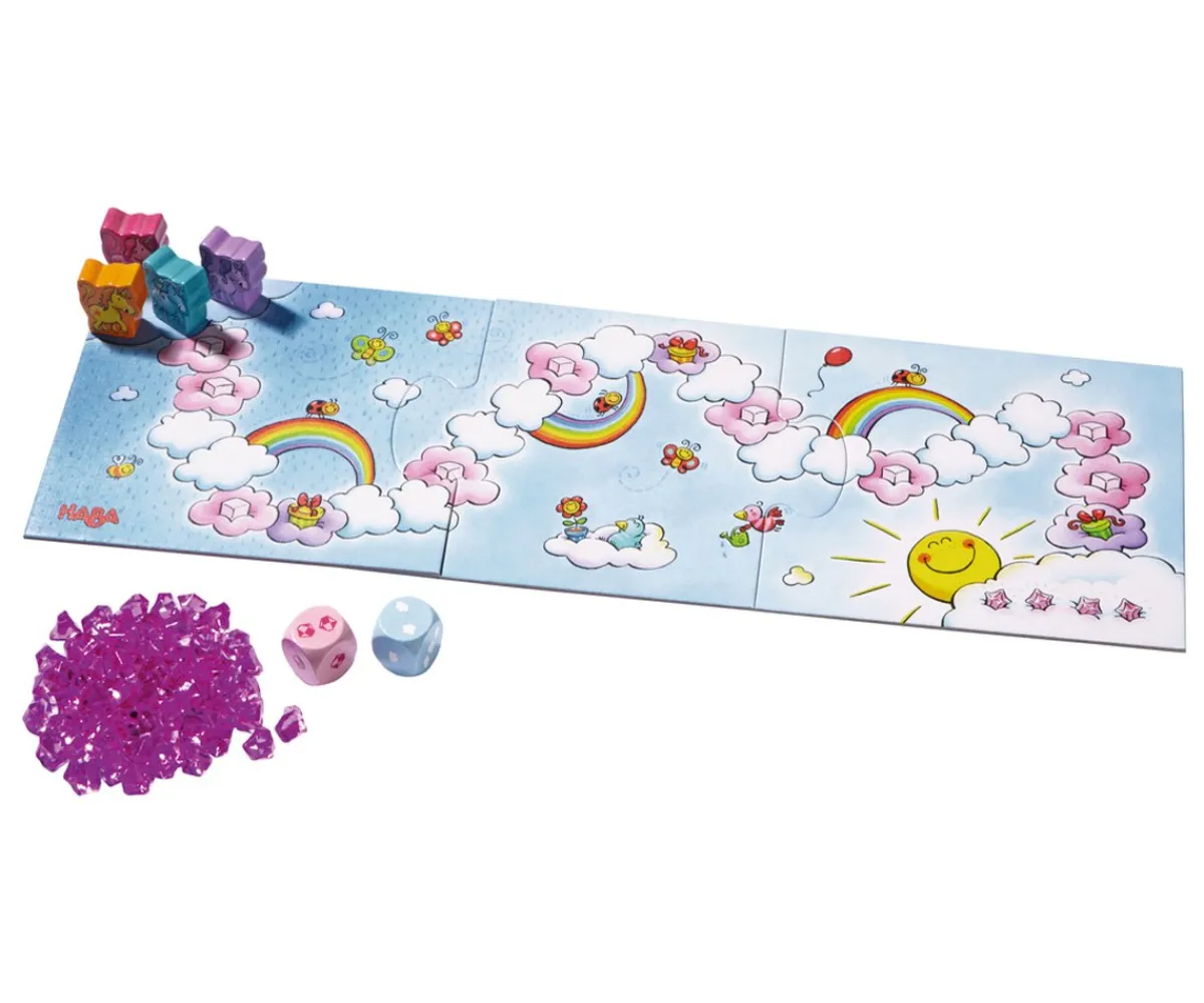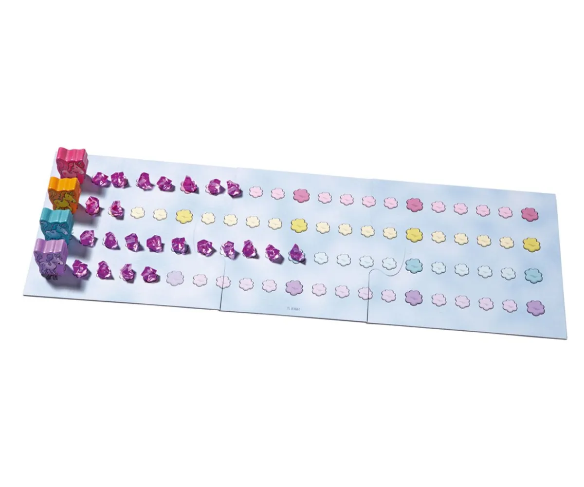 - Contiene: 1 tablero de juego, 1 unicornio Destello de color rosa, 1 unicornio Astro de color amarillo, 1 unicornio Flor de color lila, 1 unicornio Espiral de color turquesa, 60 cristales de nubes, 1 dado de cristal de color rosa, 1 dado de nubes de color azul e instrucciones del juego