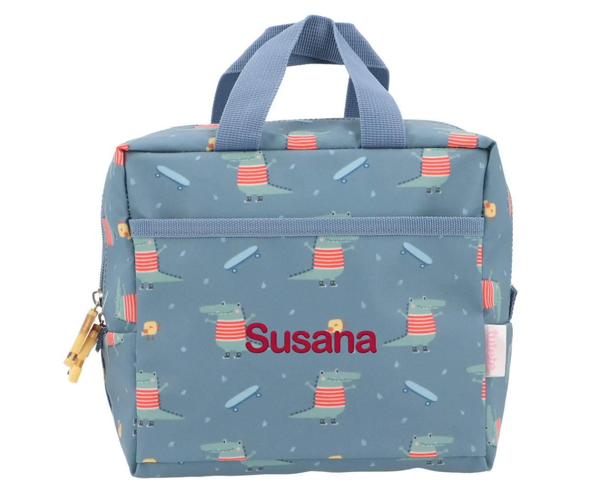 Tiene 2 asas cortas, para fácil transporte, y un bolsillito exterior donde puedes guardar cubiertos o pequeños objetos que necesites tener más a mano, que se puede personalizar con el nombre.
