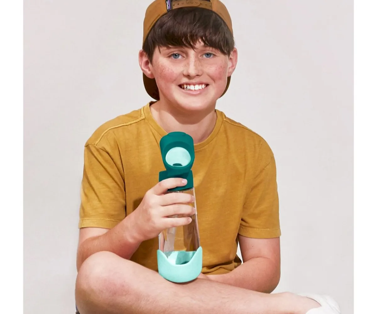 La botella Emerald Forest 600 ml de B.Box es ideal para todas las edades. Su forma exclusiva de triángulo está diseñada para las manos de los más pequeños, lo que facilita un cómodo agarre.