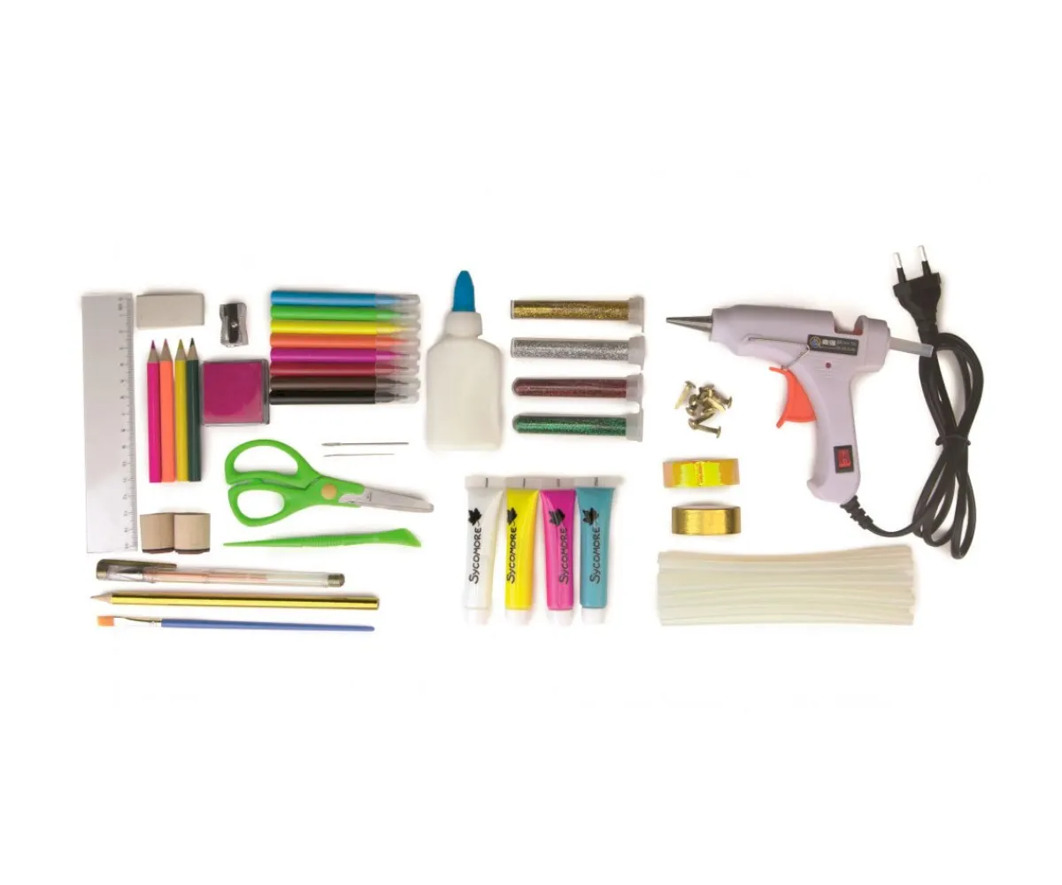 - Incluye: rotuladores,lápices de colores, papel, pompones, plumas, pedrería, lentejuelas,tijeras, goma de borrar, regla,sacapuntas,cinta de carrocero,espuma, hilo de chenilla, hilo de algodón, sujetadores parisinos, pinzas para la ropa,cuentas de hierro, cuentas de madera, formas de madera, bolígrafo dorado, cola blanca, pintura, pincel, pistola de pegamento…