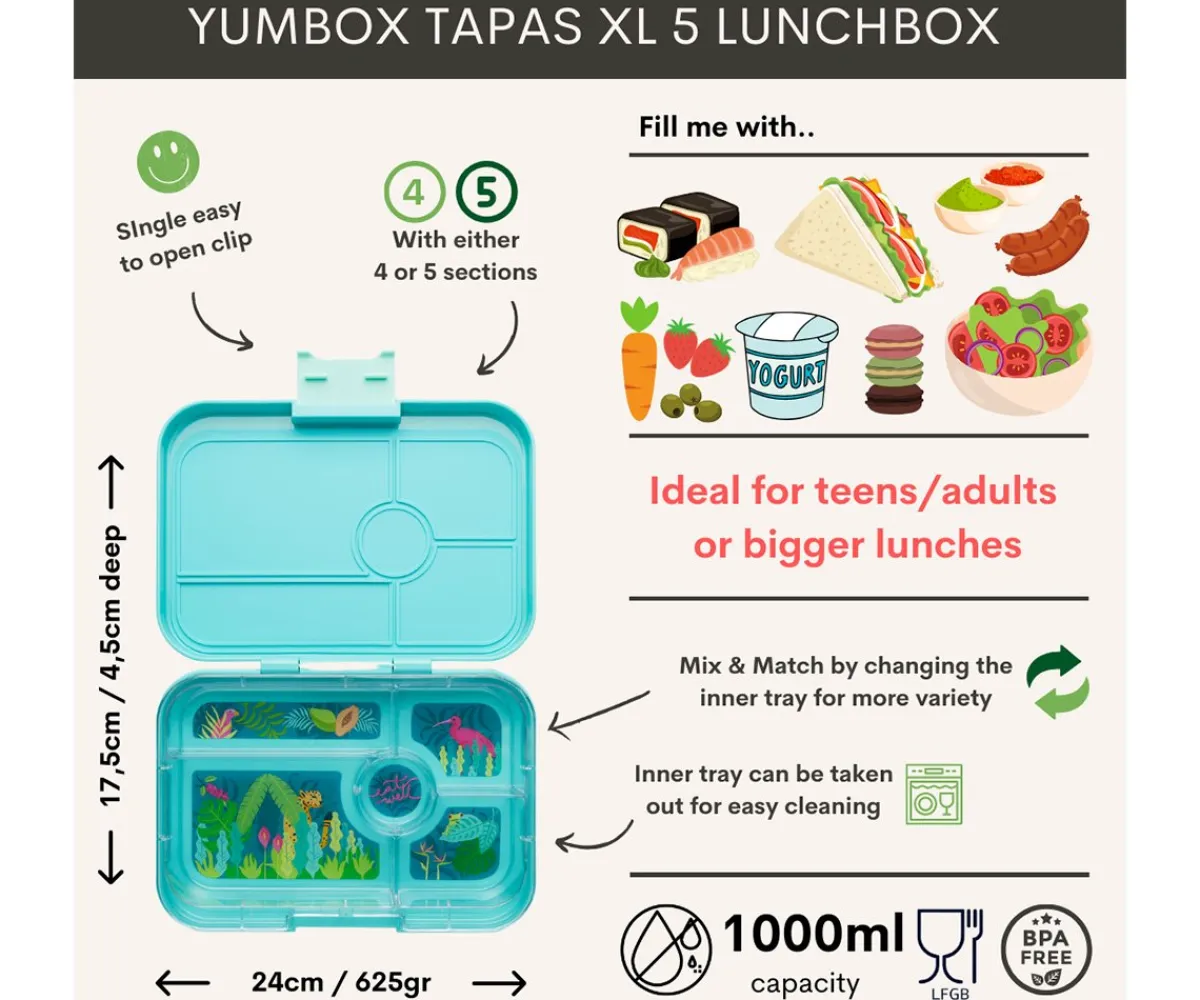 Su tapa con junta de silicona garantiza un cierre hermético, ideal para transportar yogur o salsas sin derrames. Con 5 compartimentos, dibujos divertidos y muy fácil de usar.
