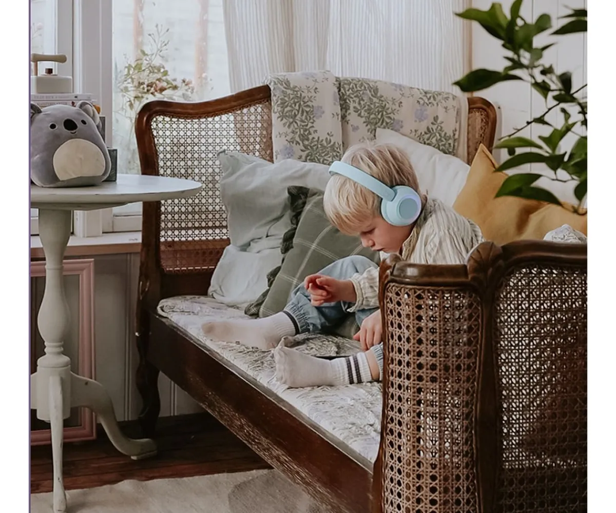 Coloridos auriculares Bluetooth de Lalarma, diseñados para ofrecer una experiencia auditiva envolvente y divertida. Sus luces RGB en los auriculares cambian de color suavemente mientras suena la música, haciendo que cada escucha sea más especial.