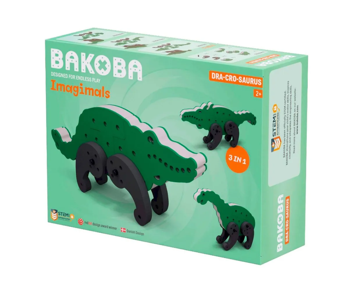 Descubre el kit de iniciación BAKOBA Imagimals formado por 10 piezas de EVA, blanditas y doblables, que podrás ensamblar una y otra vez, girando las piezas, para formar un dragón, un cocodrilo o un dinosaurio.