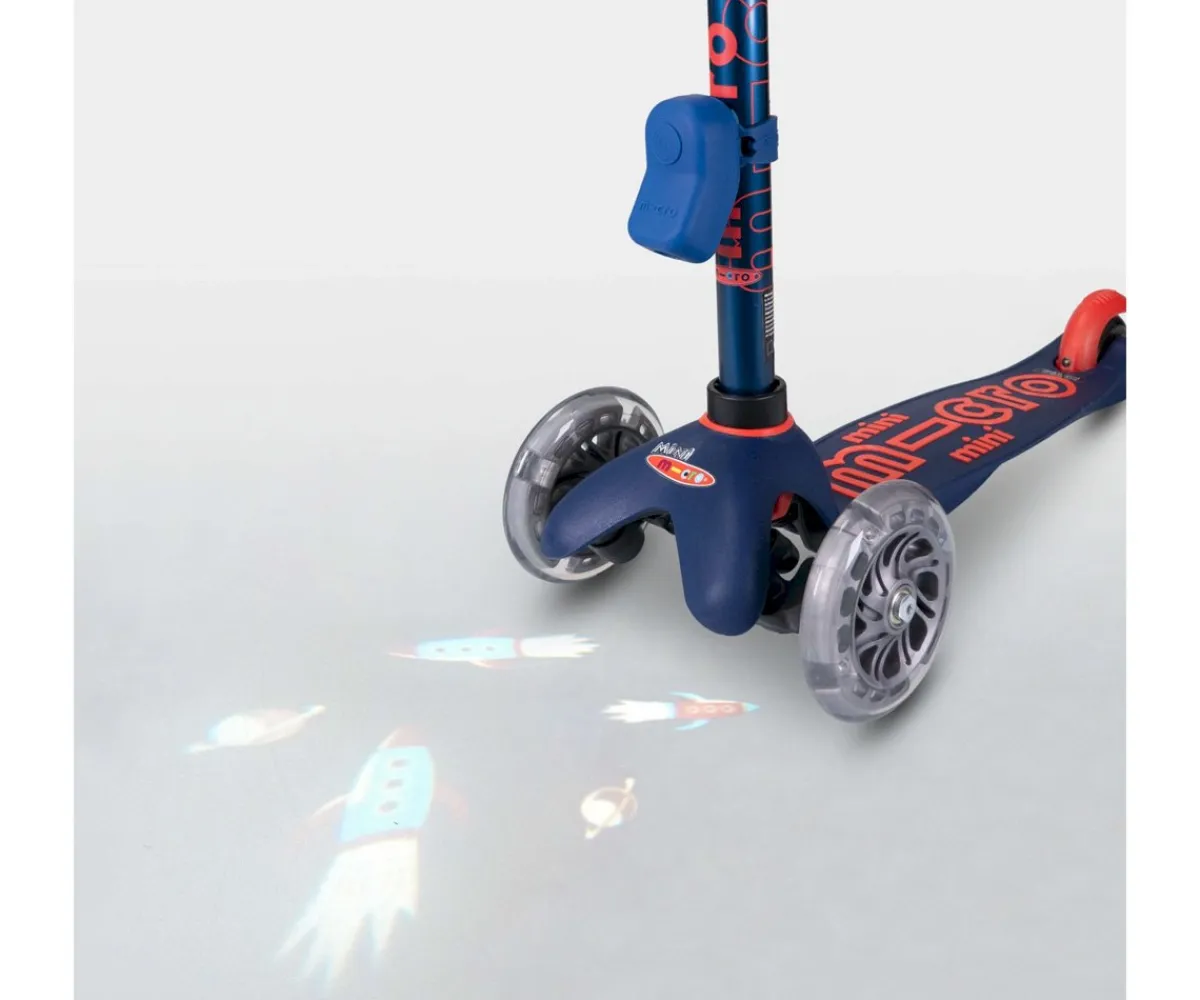 Añade al manillar de tu patinete esta original luz de suelo que refleja divertidas pegatinas de geniales cohetes en el suelo en la oscuridad.