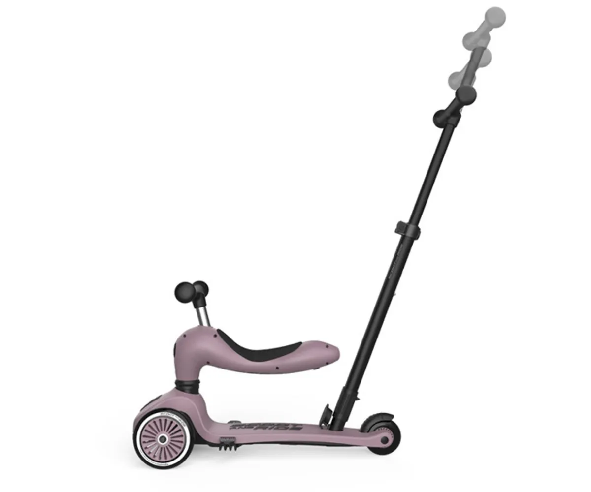 El patinete Highwaykick 1 Push and Go de la marca Scoot and Ride, combina todas las ventajas del Highwaykick One con una nueva característica: la barra de empuje para padres y madres.