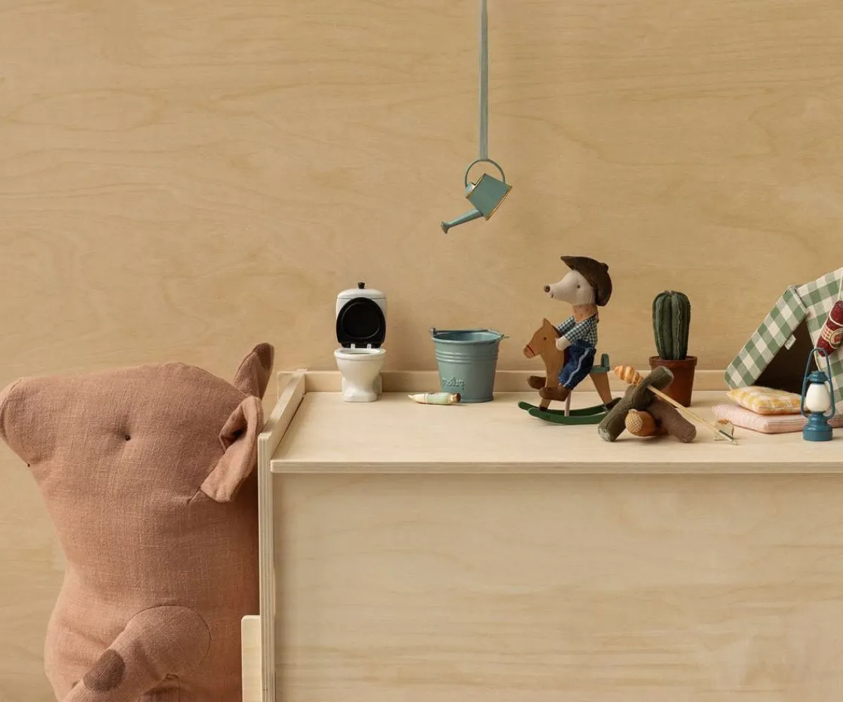 El ratón hermano pequeño de Maileg va vestido de vaquero con uno jeans, una bufanda y un sombrero, y está acompañado de su caballo balancín. Cuenta con imanes en las manos para que pueda sentarse solito en su caballo.