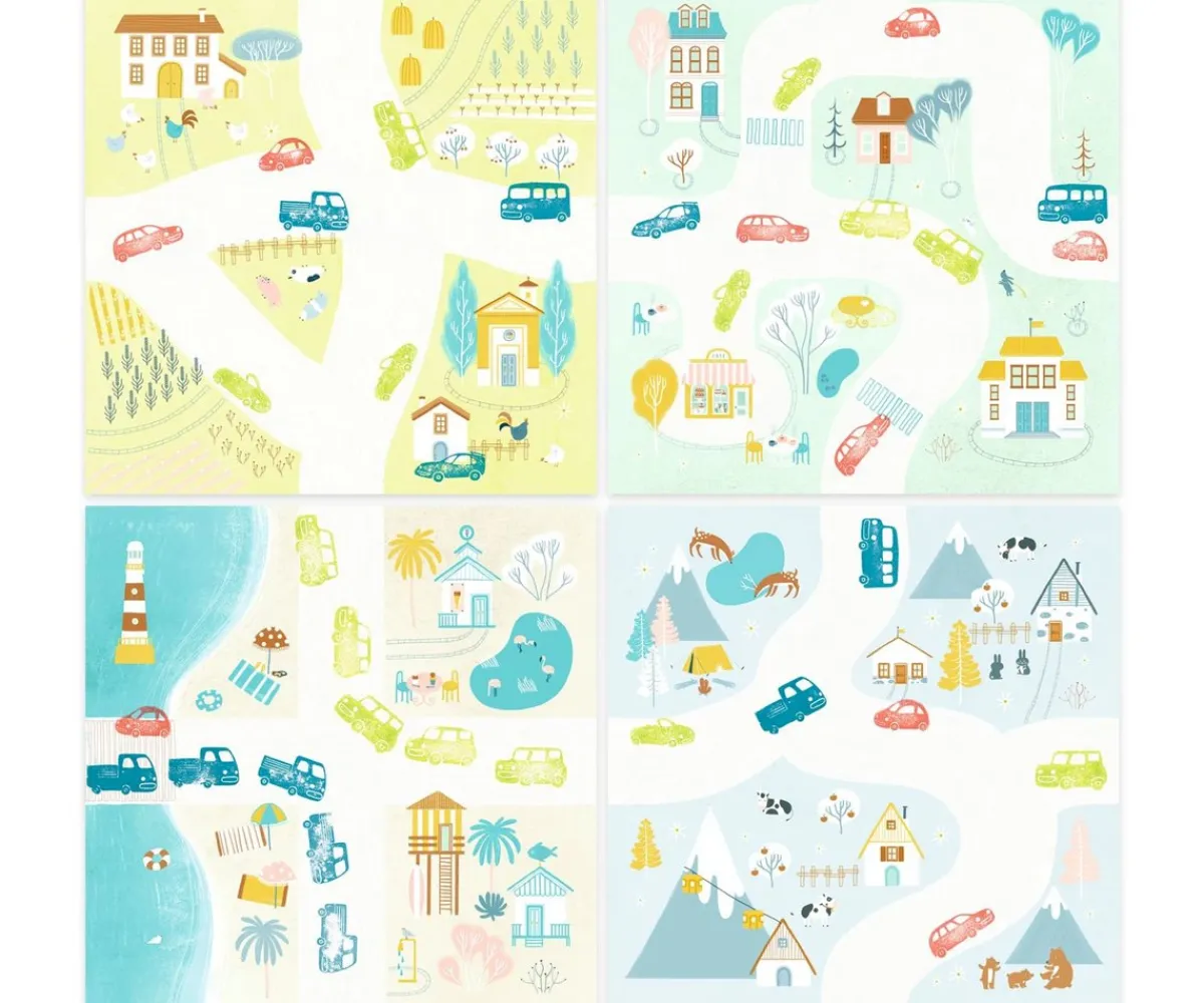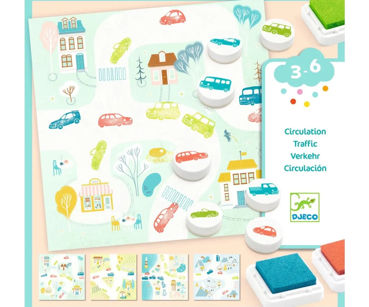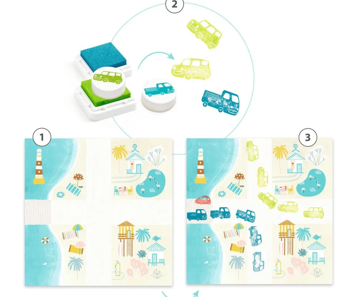 - Contenido: 16 tarjetas ilustradas para estampar, 3 grandes almohadillas de tinta ( azul, verde y naranja), 7 sellos e instrucciones paso a paso