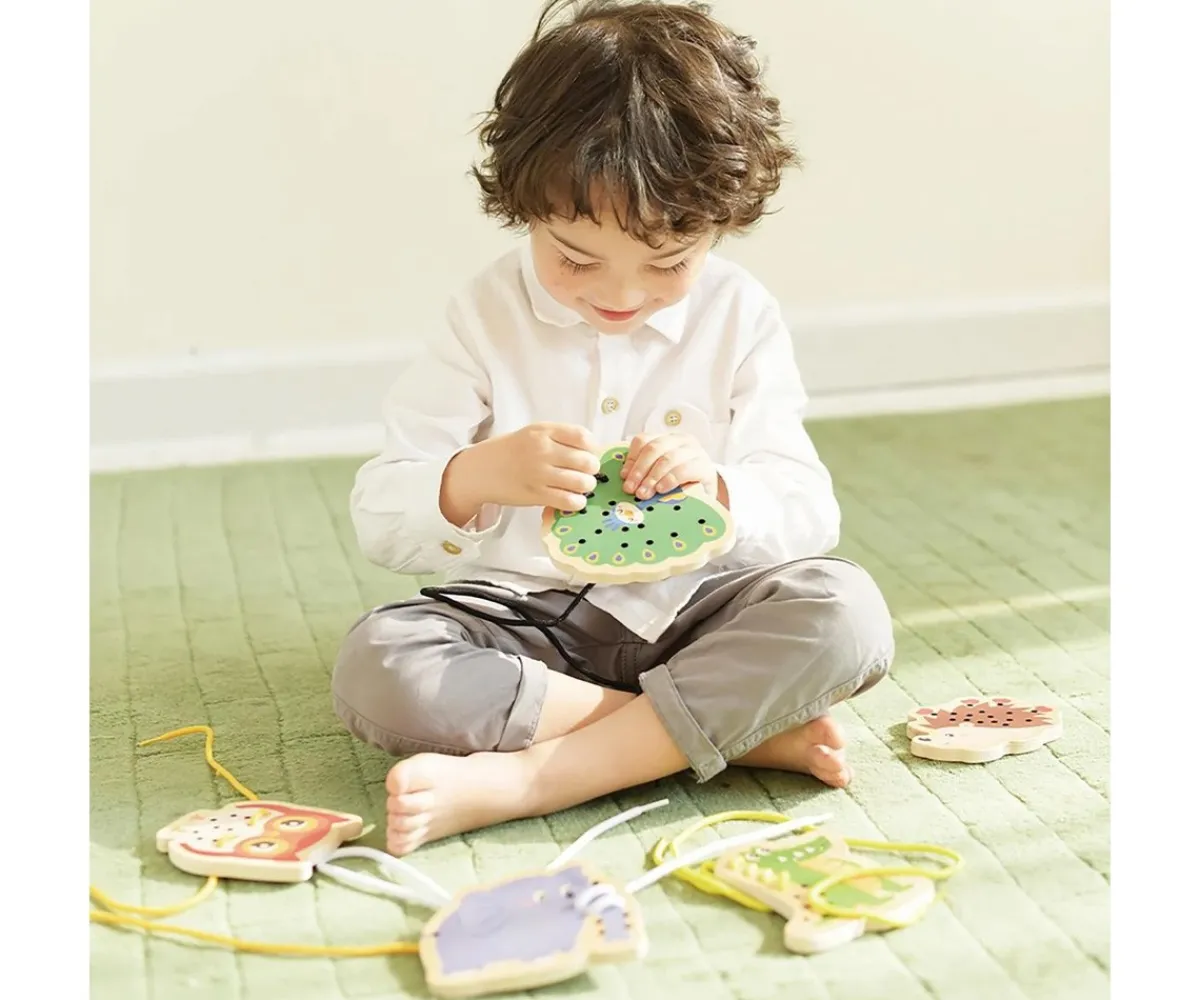 ¡Enhebra el hilo a través de los diferentes animalitos de madera!