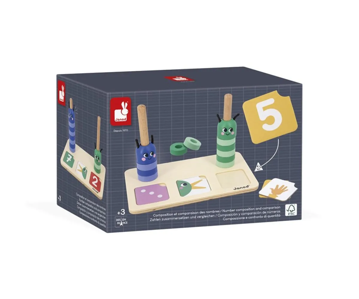 Este bonito juego de madera permite aprender a reconocer las caras de un dado, expresar una cantidad con los dedos e identificar la correspondencia con un número. Al unir las piezas de colores sobre el tablero, tu peque comprenderá cuántas cuentas debe añadir o quitar al cuerpo de la oruga para obtener una cantidad. Este juego se adapta al ritmo de aprendizaje de cada niño. Por lo tanto, una vez hayan compuesto los números, podrán aprender la noción de comparación «mayor que» y «menor que»
