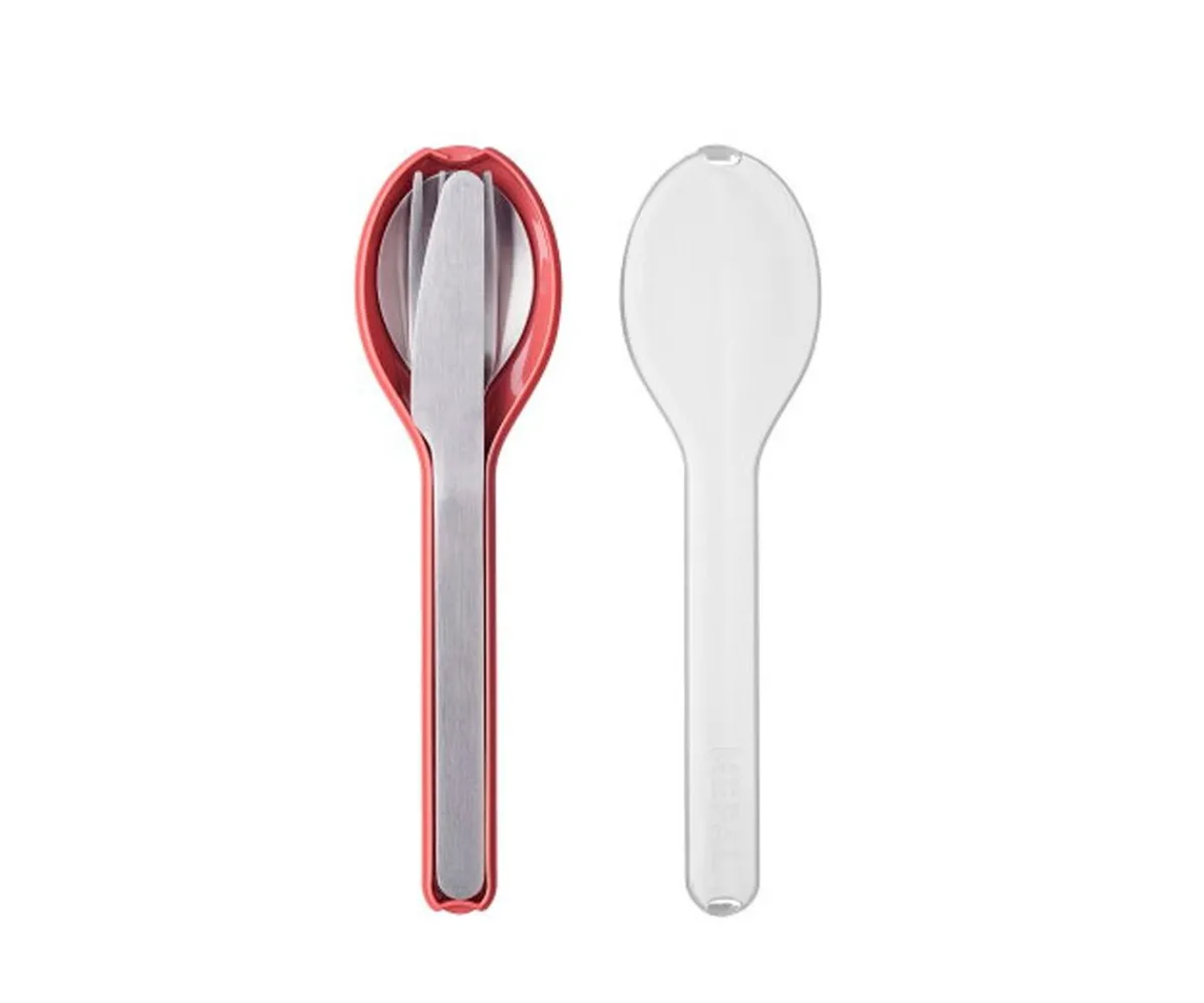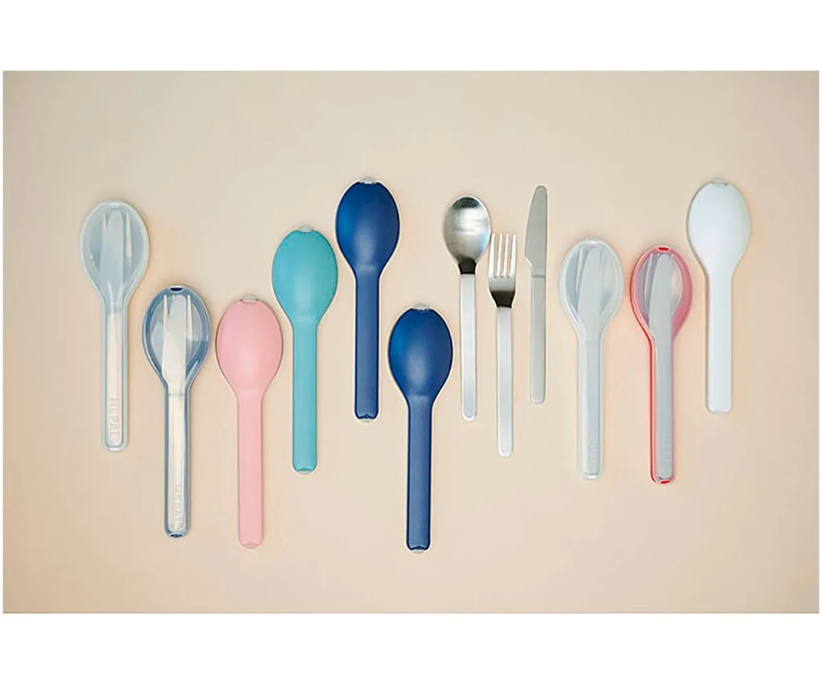 Este práctico set de cubiertos consta de un cuchillo, un tenedor y una cuchara unidos por un soporte de plástico.