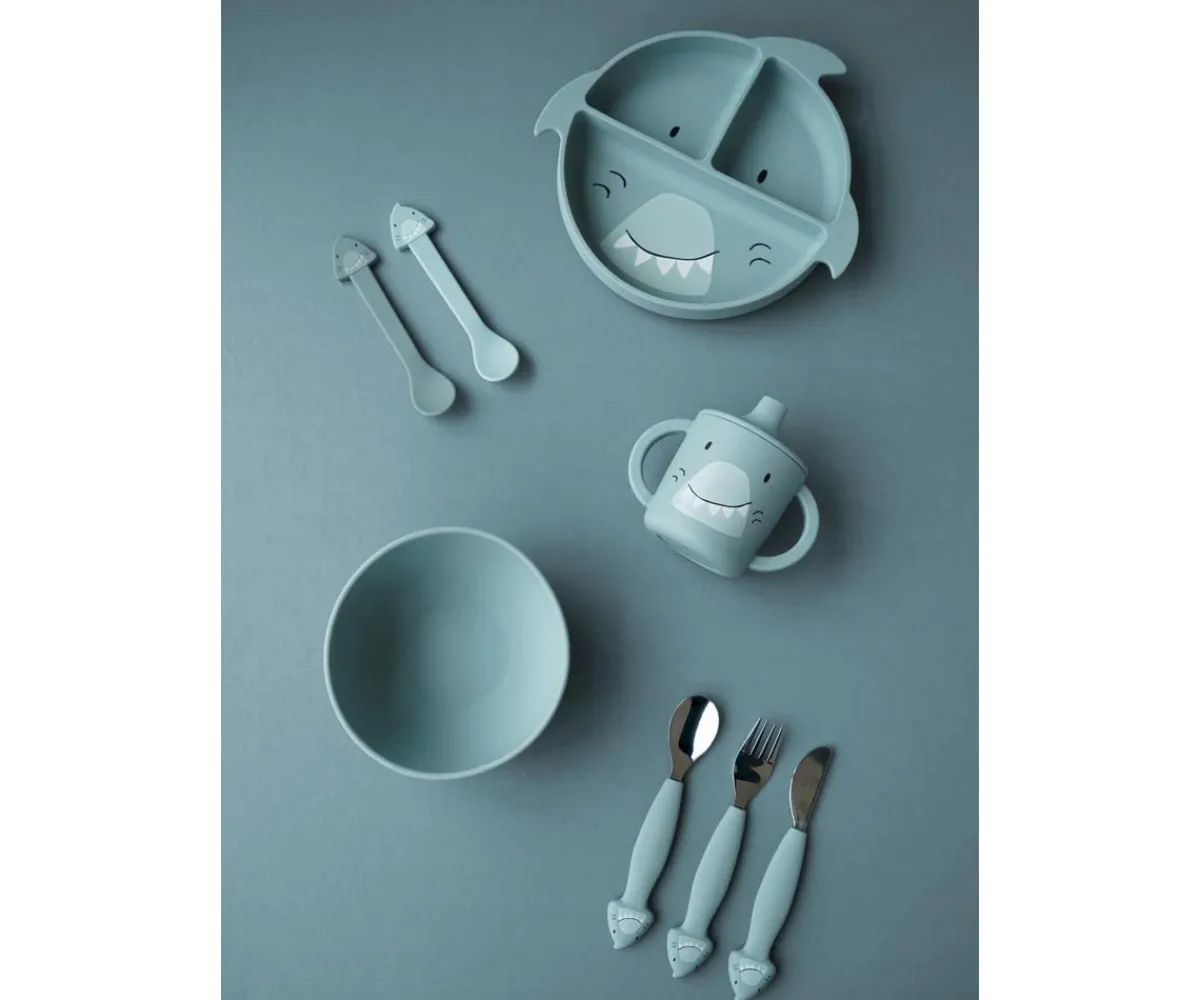 Set de 3 cubiertos de silicona de la colección Mr. Shark de Trixie para comer, ideales para alimentar a tu bebé.