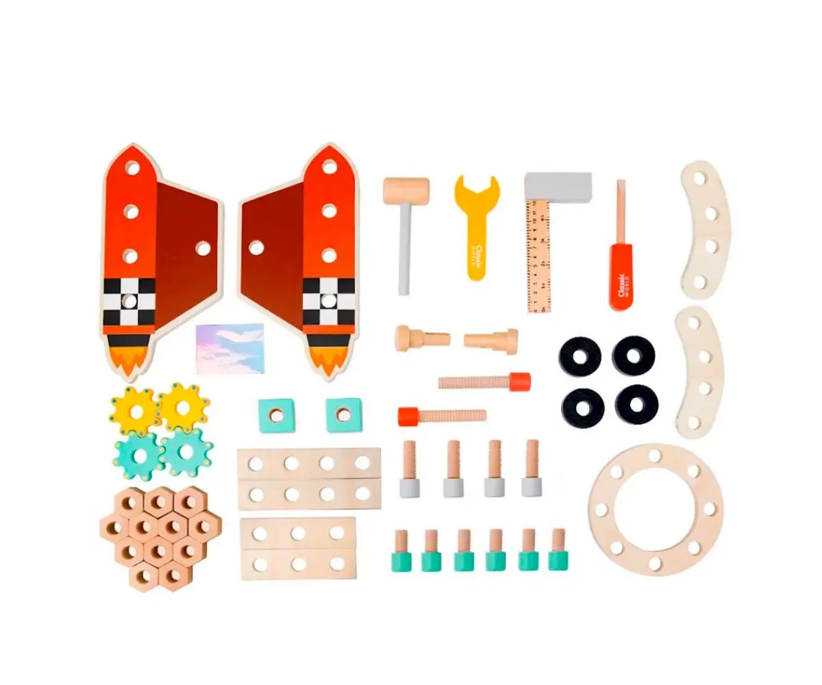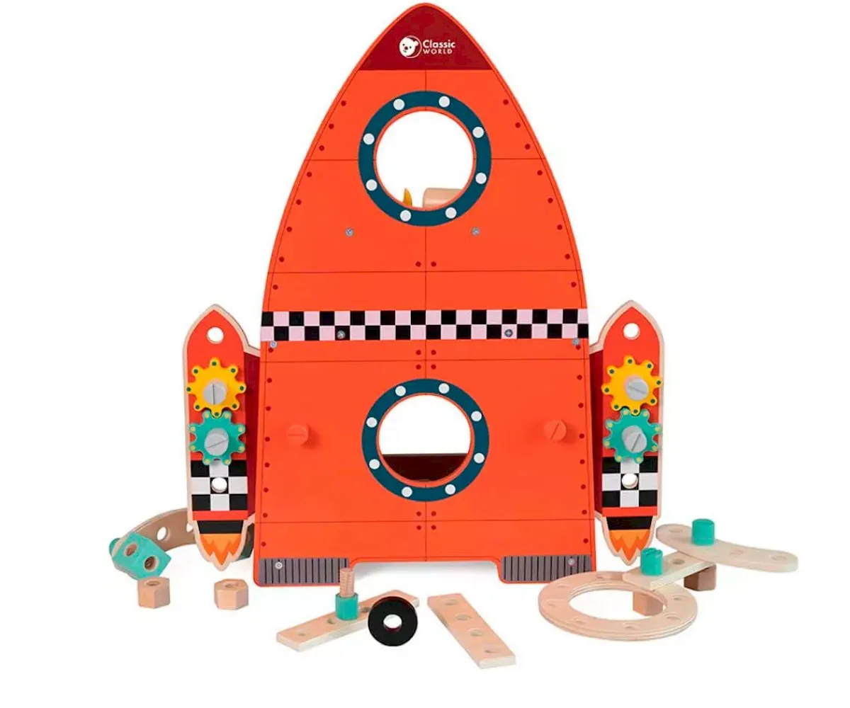 Este original banco de trabajo con forma de cohete permitirá que los peques realicen mientras que juegan, todas sus creaciones.El tablero de la mesa incluye agujeros para facilitar a los peques el manejo de las herramientas.