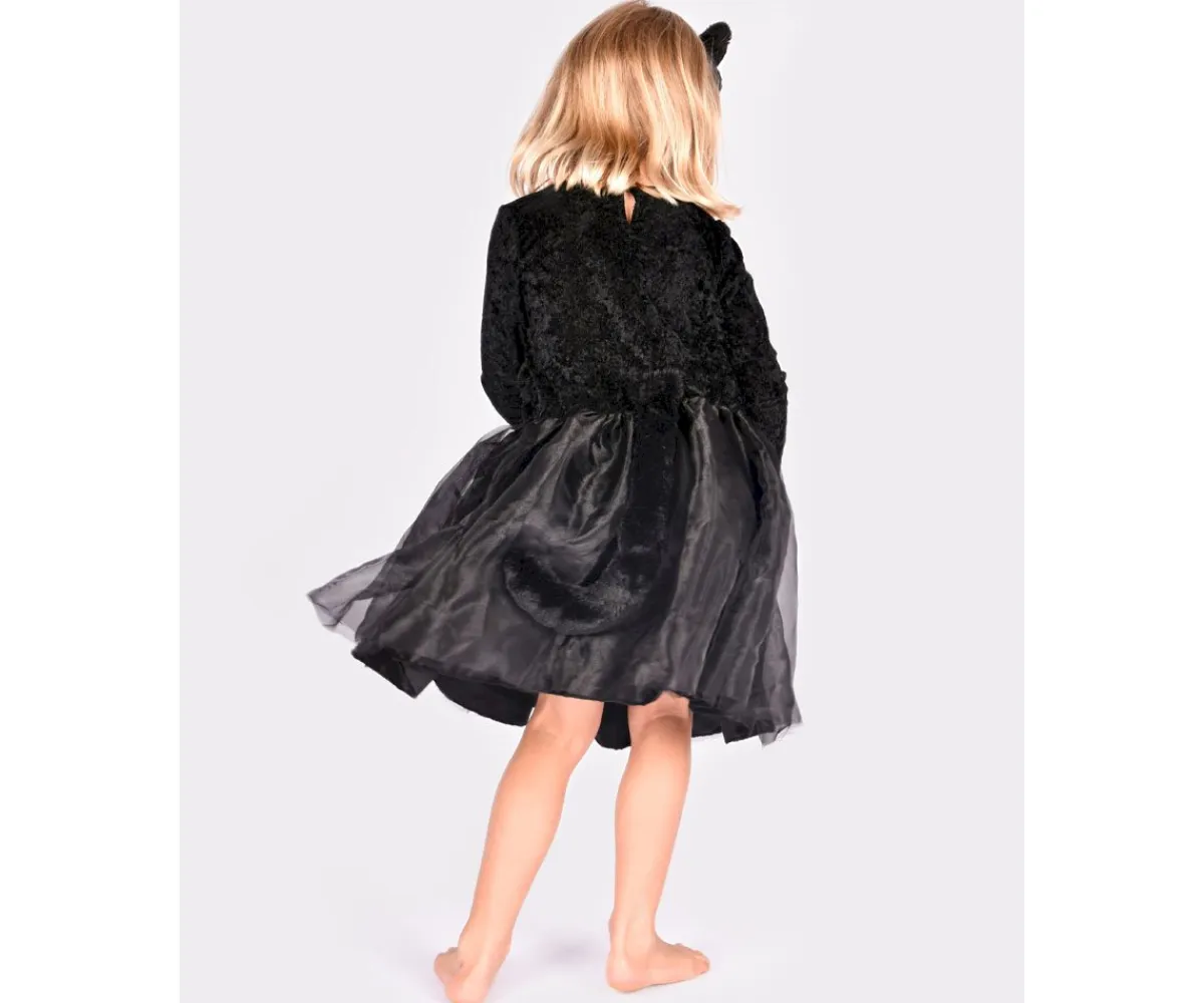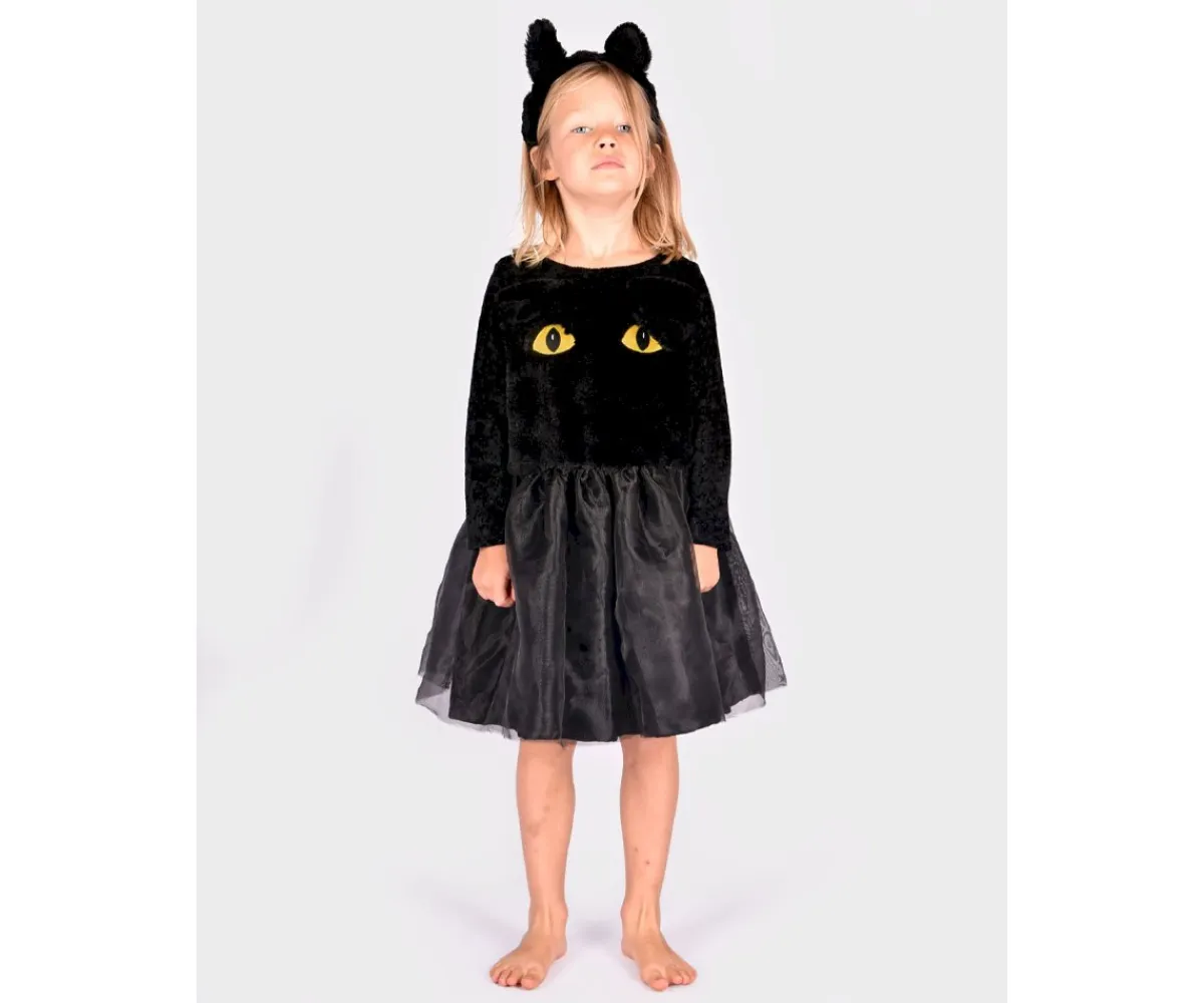 Los peques se convertirán en un genial super héroe gatito con el disfraz Den Goda Fen formado por una falda de tul, un corpiño esponjoso con ojos de gatito bordados, orejas cosidas y mangas de terciopelo negro triturado.