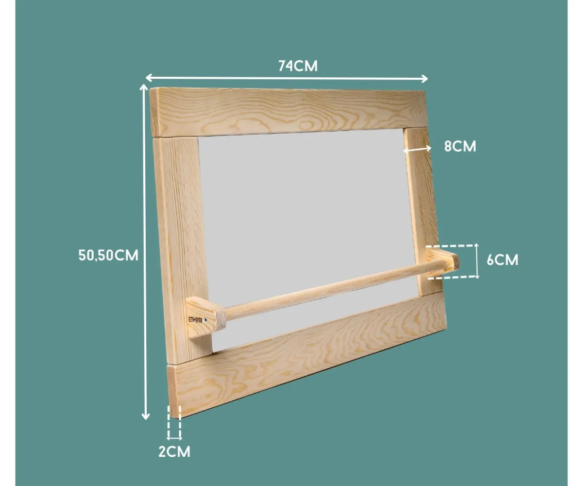 El espejo de madera montessori con barra de apoyo de la marca Ethos Wood es una herramienta ideal para fomentar el desarrollo de los peques de forma muy divertida y estimulante.