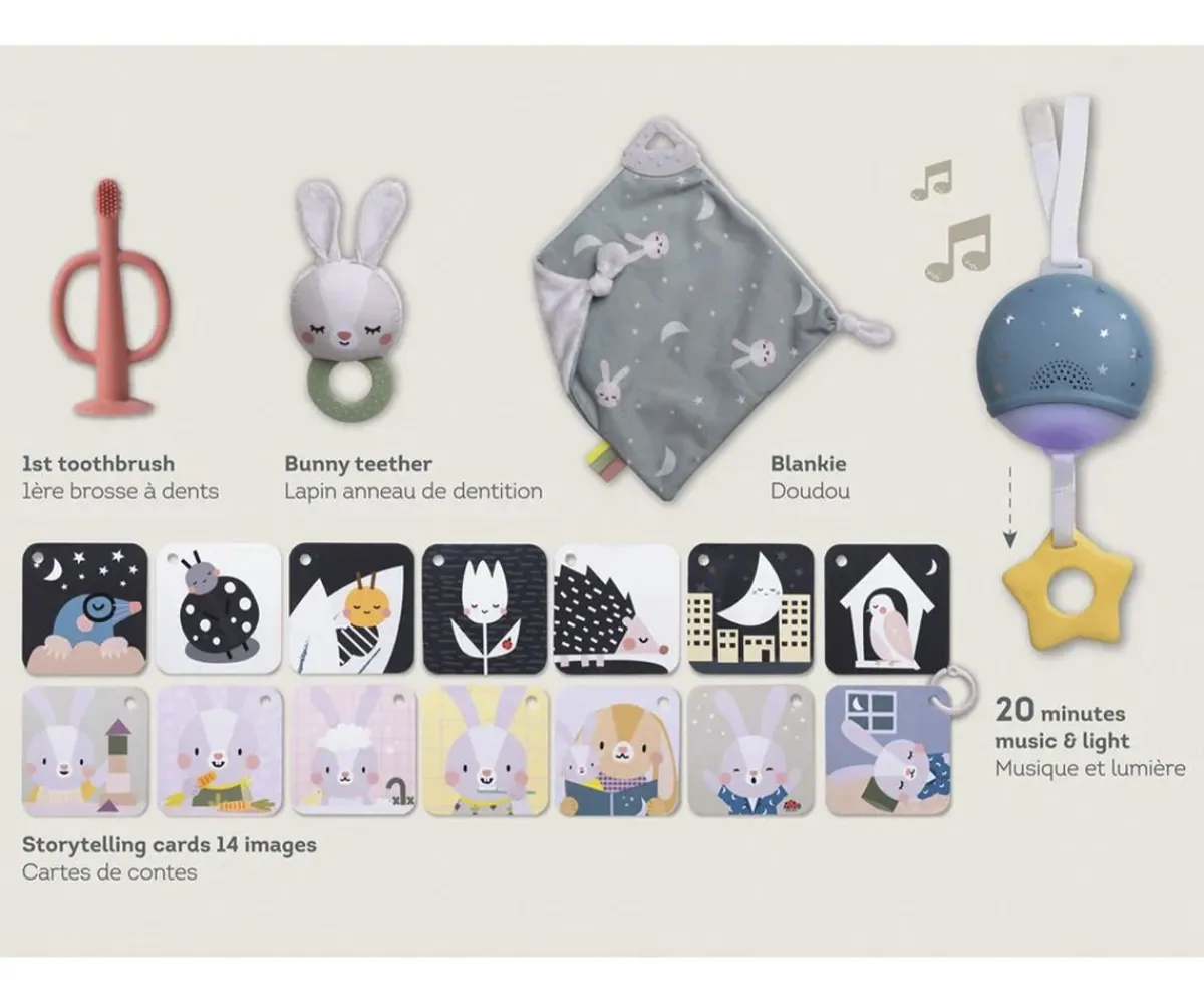 - Contiene: Juguete musical y luminoso, 7 tarjetas ilustradas a doble cara, sonajero-mordedor de conejito, 1 cepillo de silicona suave y un doudou