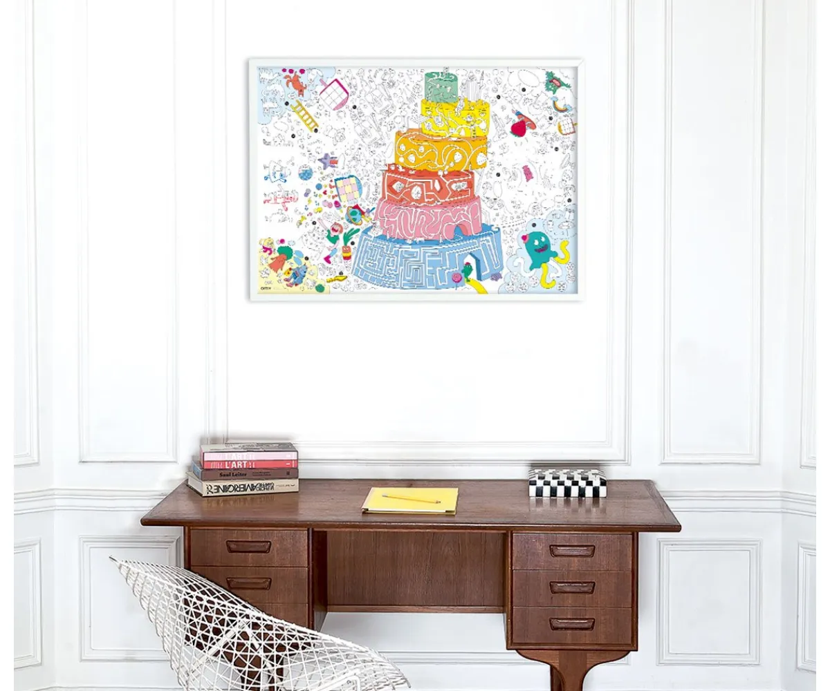 Original póster gigante + lápiz de doble punta con un lado de grafito y otro de 5 colores con el que los peques se divertirán buscando donde están los diferentes juegos y coloreando.