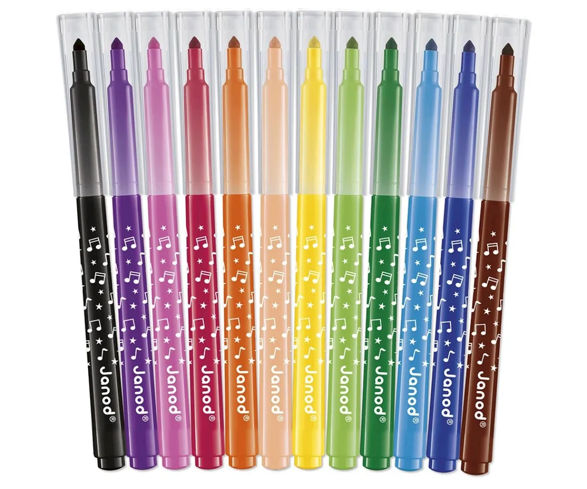 Pack de 12 rotuladores de colores Janod con punta fina, para que los peques disfruten de sus dibujos.