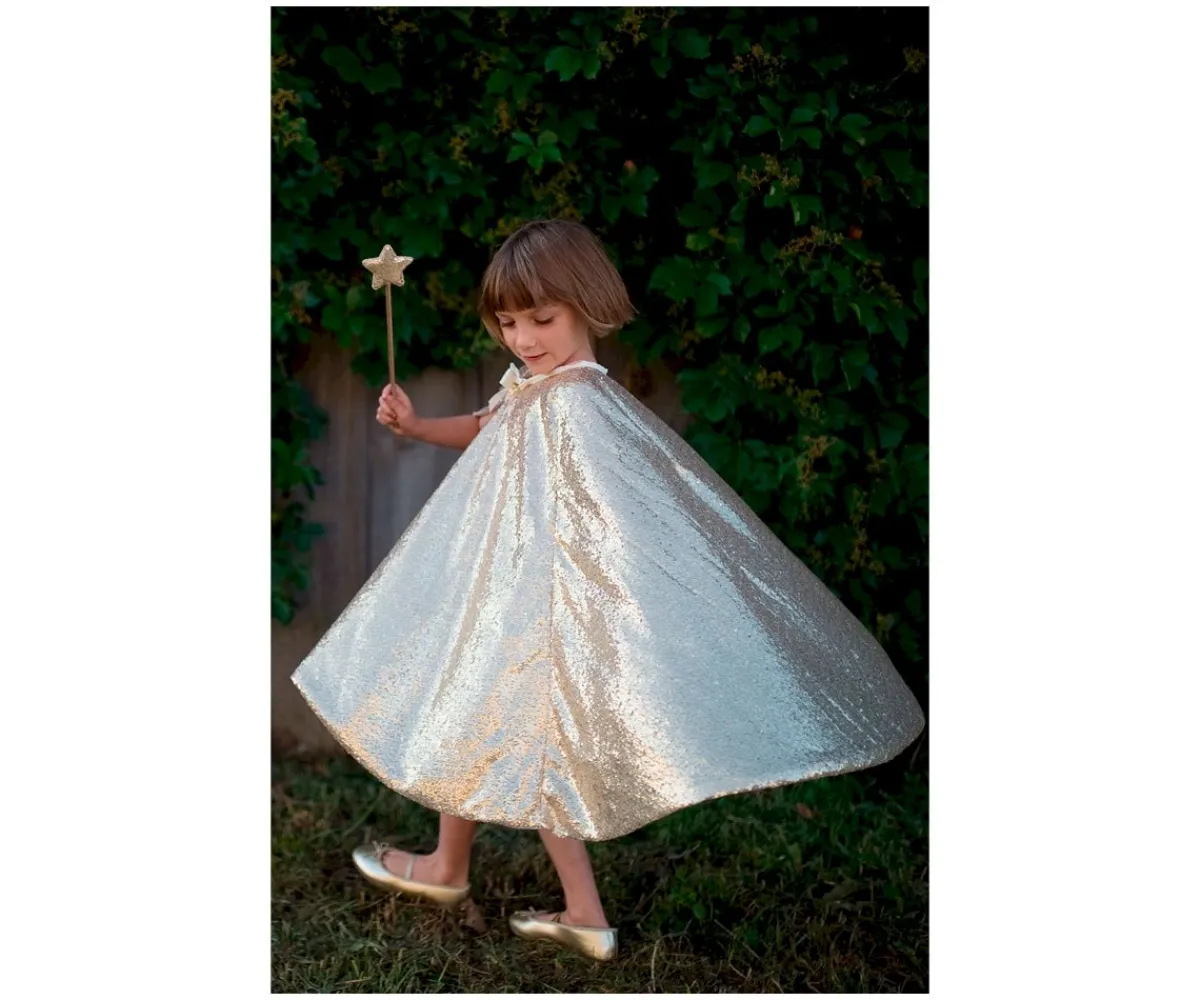 Con esta preciosa y brillante capa de lentejuelas doradas,el cuello está forrado suavemente y tiene un bonito lazo color crema. los peques se sumergirán en un mundo de fantasía y magia.