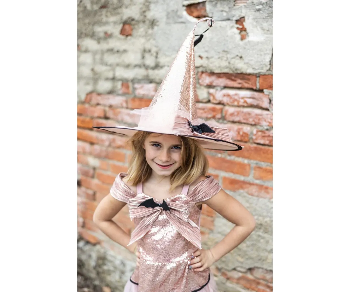 - Sombrero de bruja de tela brillante color oro rosa con acabado glitter