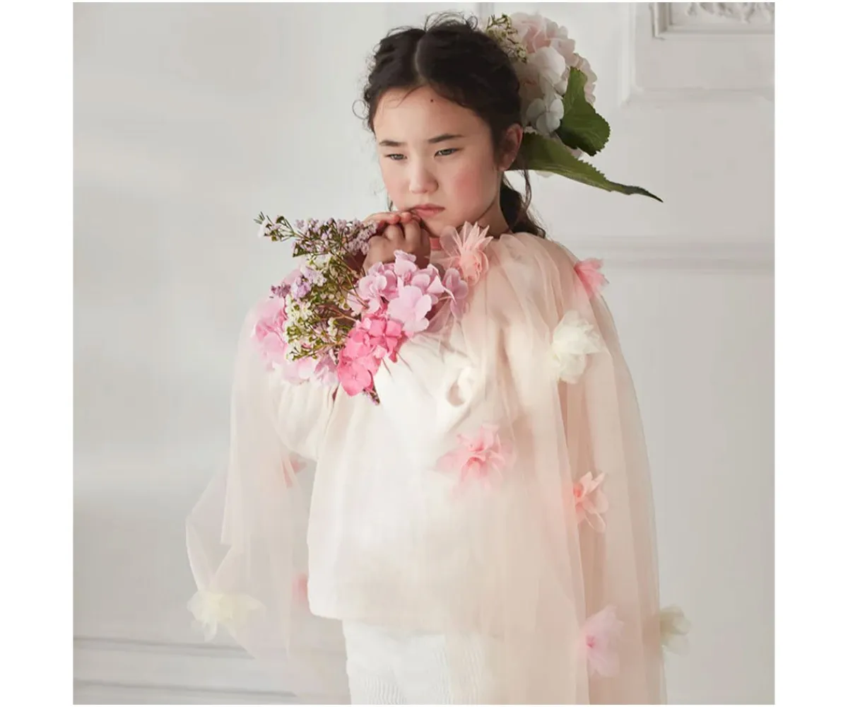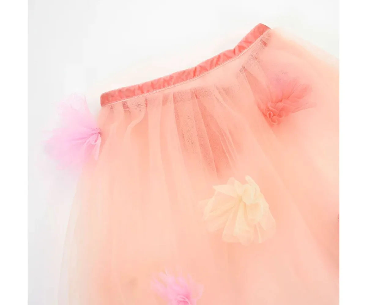 La preciosa capa confeccionada en tul de color melocotón adornada con flores de tul en rosa, melocotón, rubor y amarillo pálido de Meri Meri será el complemento ideal para el disfraz de los peques.