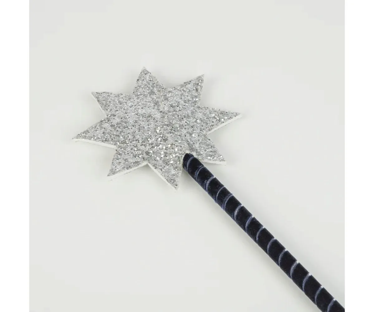 - Varita de madera forrada con cinta de terciopelo azul y estrella plateada brillante
