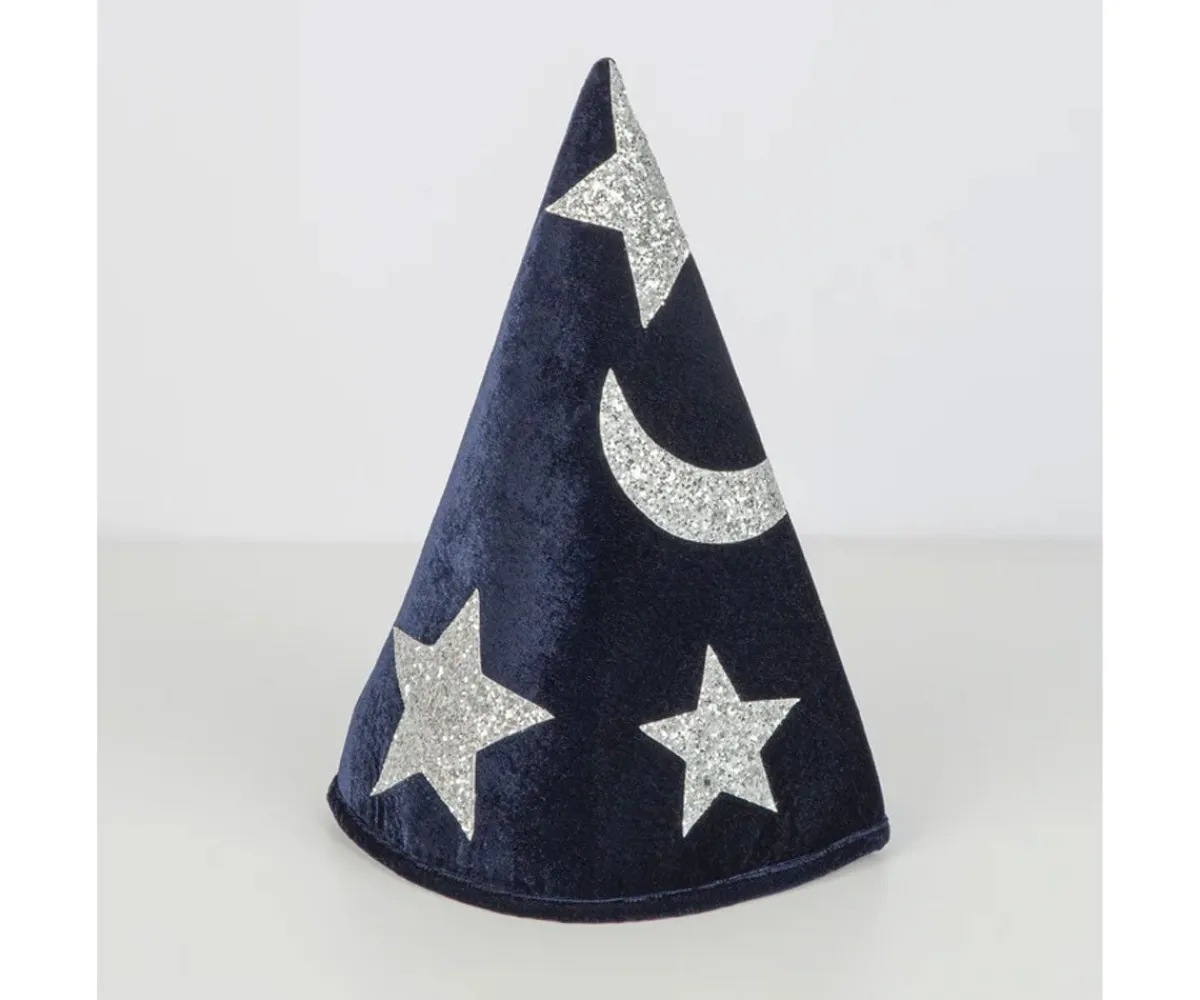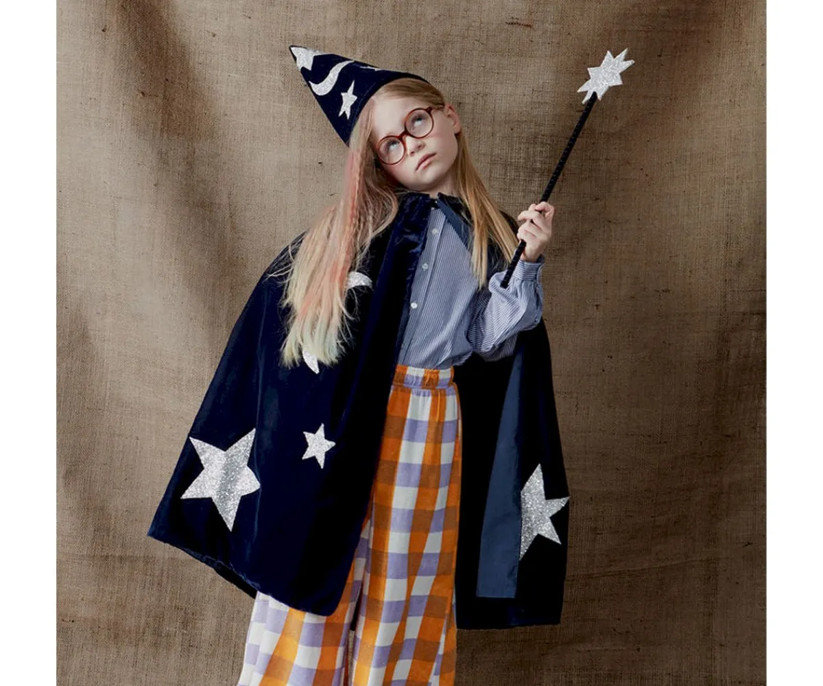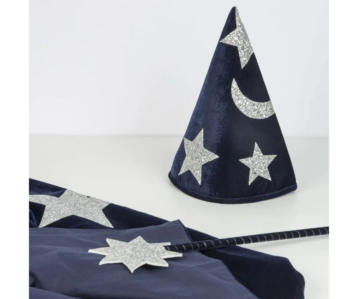 Préparate para convertirte en todo un mago con el lujoso disfraz de terciopelo azul con estrellas y luna de tela con brillo plateado de Meri Meri.