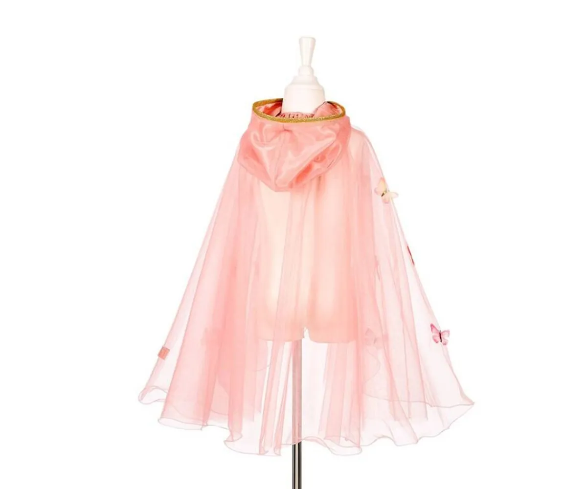Esta preciosa capa es ligera y vaporosa, de tul rosa, adornada con bordados de mariposas multicolor y ribete de glitter dorado alrededor de la capucha. El cierre bajo el cuello se realiza con botones de perla con lazo, asegurando comodidad y estilo. Perfecta como complemento de disfraz de hada, elfo o como disfraz independiente para fiestas de disfraces.