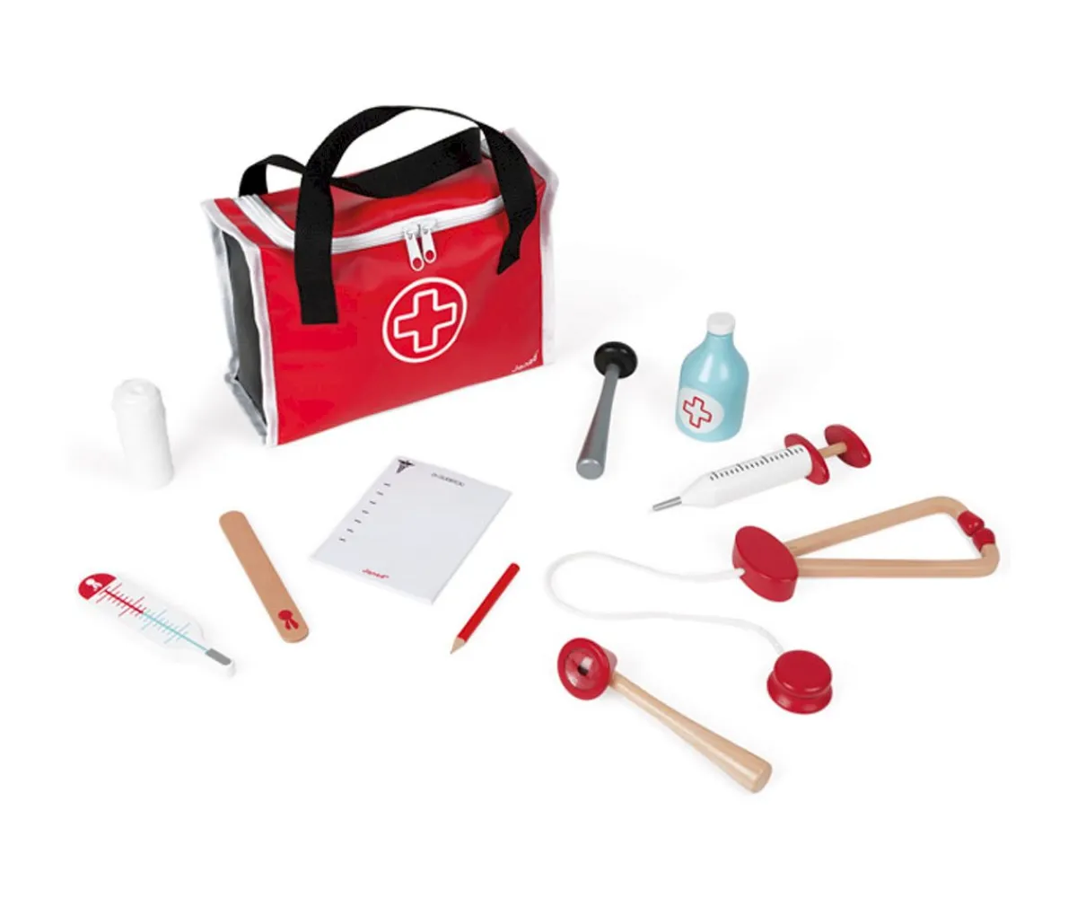 - Incluye 10 accesorios, de los cuales son de madera la jeringa, el martillo para los reflejos, la botellita de desinfectante, el estetoscopio, el otoscopio equipado con lupa, el termómetro y el palito