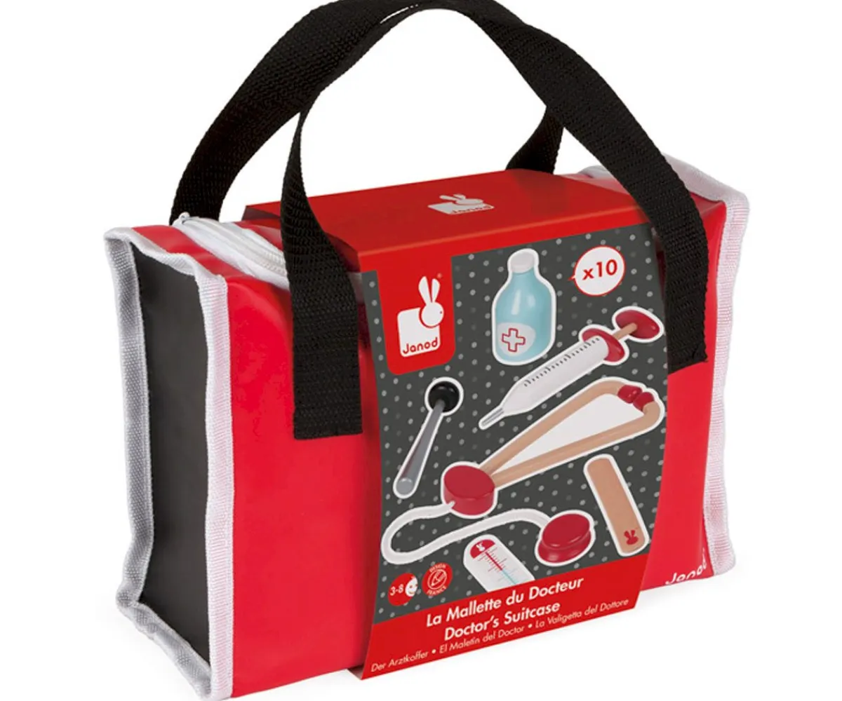 Una jeringa, un martillo para comprobar los reflejos, un estetoscopio…todo de madera, resistente y de calidad.