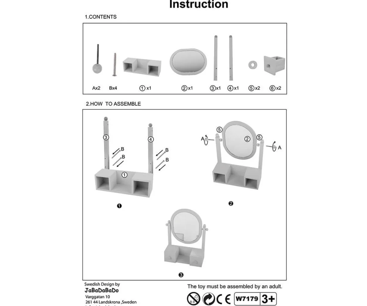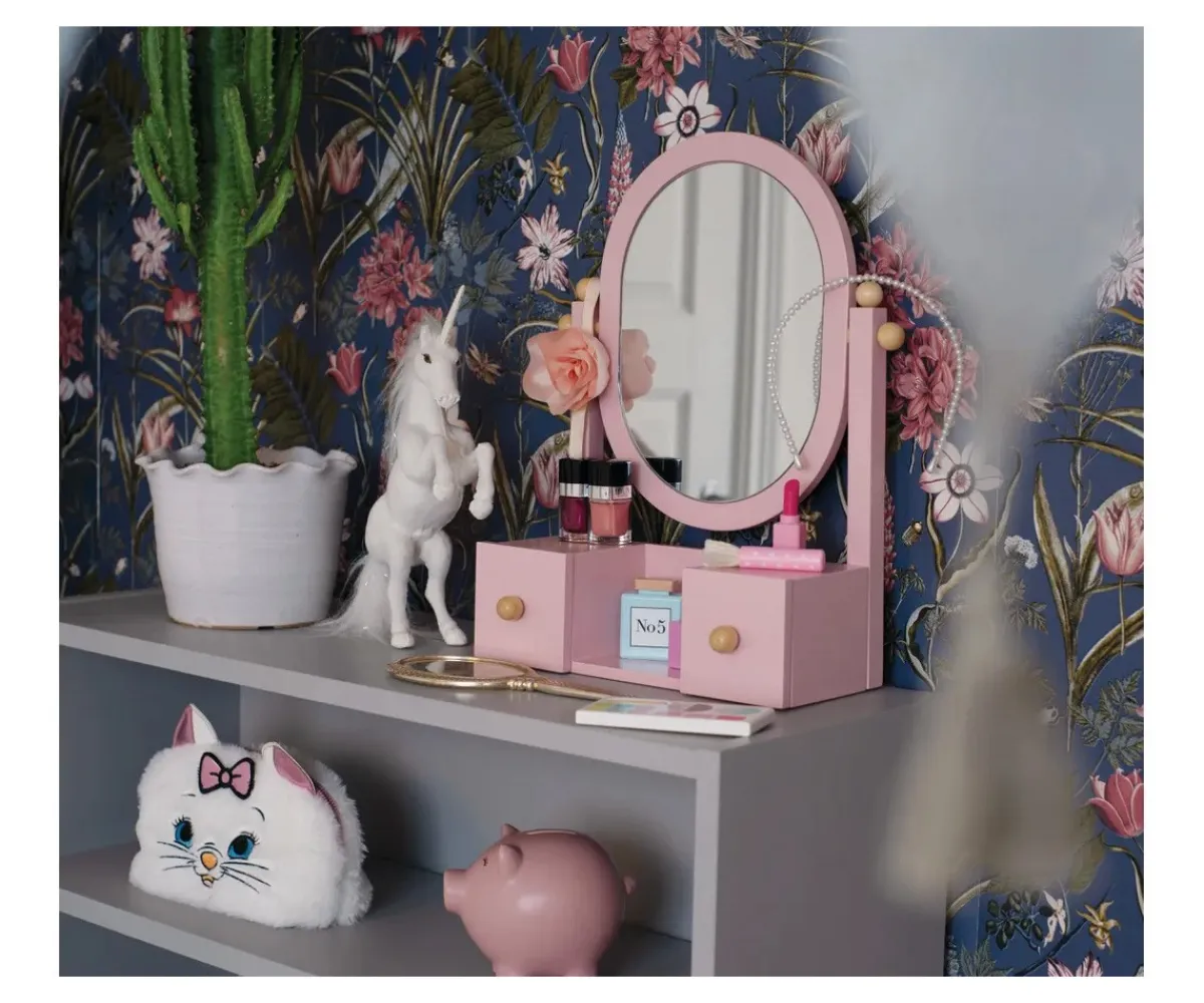 Incluye dos cajones pequeños para guardar joyas, cintas para el pelo o accesorios favoritos, además de un compartimento central abierto y perillas laterales para colgar collares o pulseras. El espejo es ajustable e inclina hacia delante y hacia atrás para mayor comodidad durante el juego.