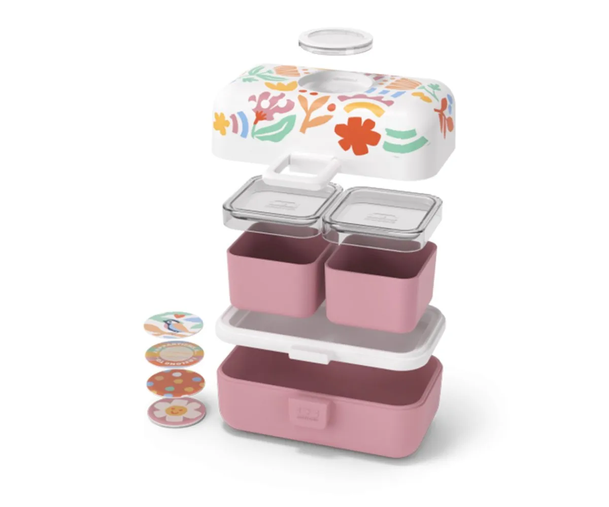 Caja de almuerzo donde podrás llevar entrante, segundo y postre. Una caja fácil de abrir gracias a sus prácticos cierres de clic y hermética para mantener la comida. Esta caja de almuerzo compacta con diferentes compartimentos incluye fichas ilustradas para colocar en la parte superior de la cajita y así tu peque se divertirá viéndola.
