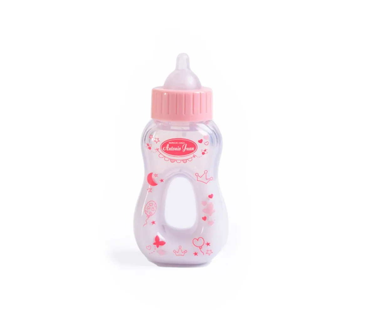 Este biberón contiene leche «mágica». Cuando le das la vuelta al biberón para alimentar a tu muñeca o peluche, la leche “desaparece”. Una vez que hayas terminado de darles de comer y vuelvas a ponerlo recto, la leche vuelve por si a la muñeca le apetece un poco más.